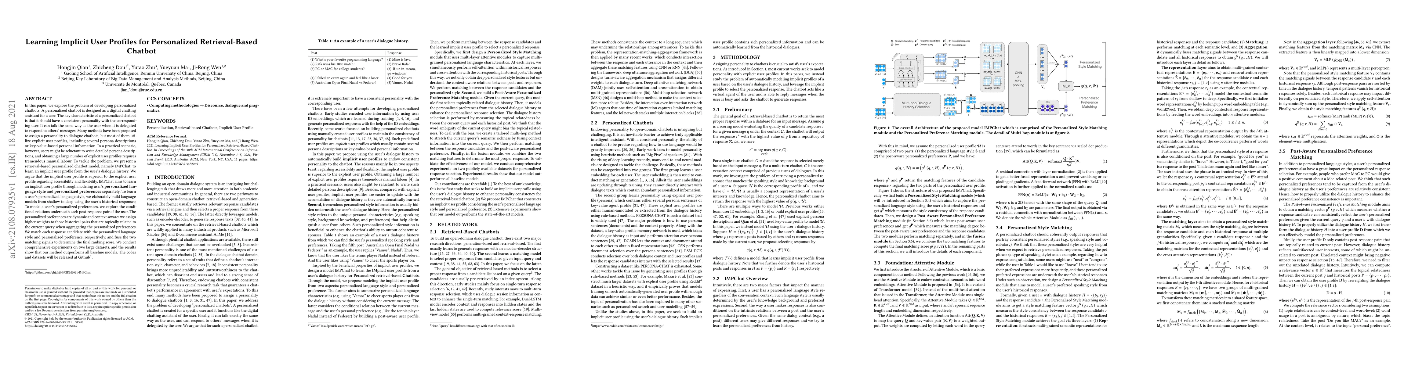 This paper proposes a personalized chatbot model called IMPChat that learns an implicit user profile from dialogue history to provide more accurate and flexible responses. It outperforms baseline models in comprehensive experiments on two large datasets.