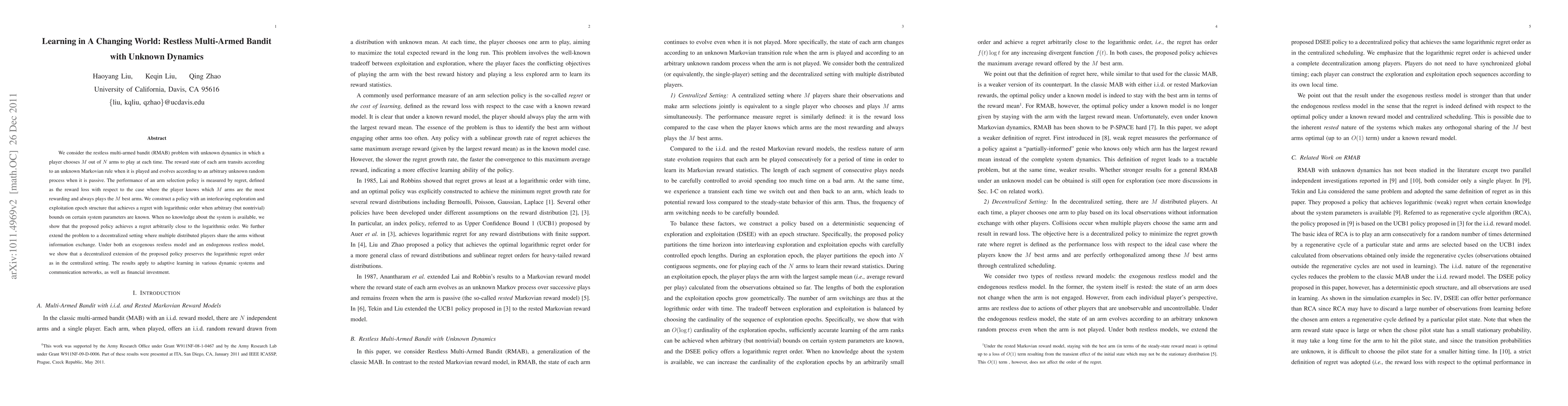 This paper addresses the restless multi-armed bandit problem with unknown dynamics, proposing a policy that achieves logarithmic regret when system parameters are known, and near-optimal regret when no prior knowledge is available. The policy is extended to a decentralized setting, maintaining logarithmic regret in both exogenous and endogenous models.