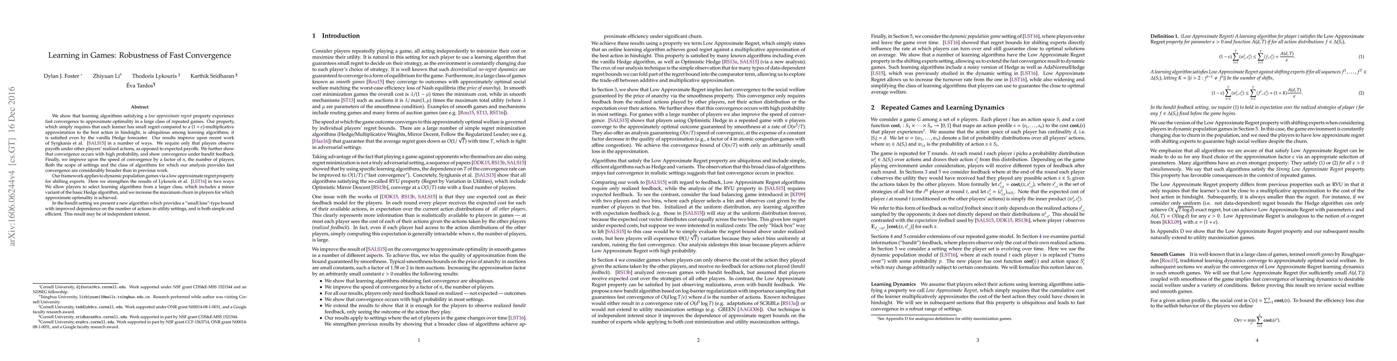Learning algorithms with low approximate regret converge to optimal actions in repeated games at a faster rate than previously thought, even for large classes of players and varying feedback settings.