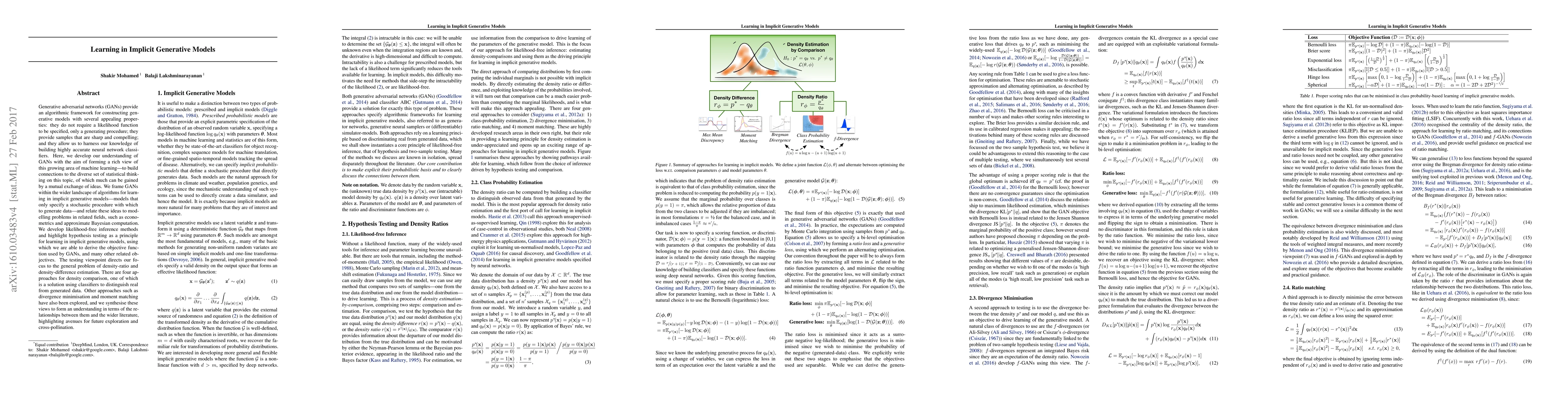 This paper explores generative adversarial networks (GANs) within the broader context of implicit generative models, emphasizing likelihood-free inference methods and hypothesis testing. It synthesizes various density ratio estimation techniques, including classifier-based, divergence minimization, and moment matching approaches, to highlight connections to econometrics and approximate Bayesian computation.