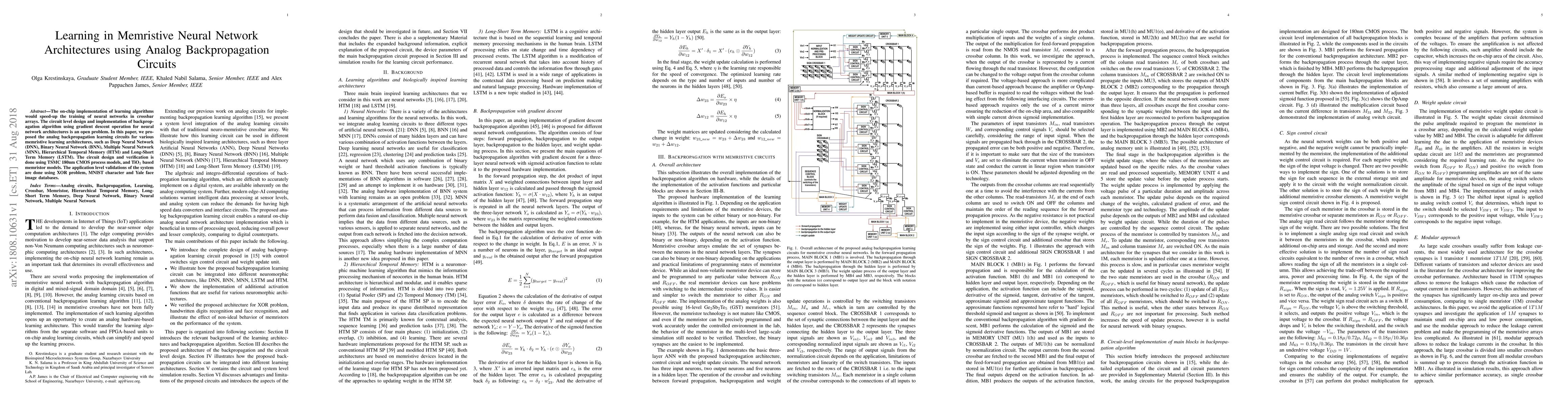 This paper proposes analog backpropagation circuits for learning in various memristive neural network architectures, including DNN, BNN, MNN, HTM, and LSTM, implemented using TSMC 180nm CMOS and TiO2 memristors. The effectiveness of the circuits is validated on the XOR problem, MNIST, and Yale face datasets.