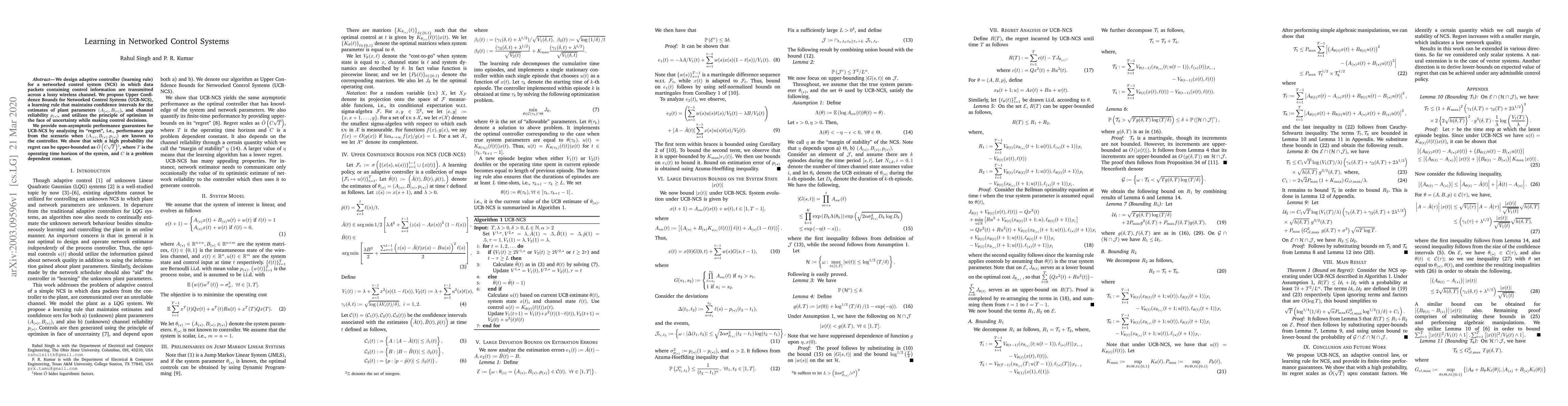 We design adaptive controller (learning rule) for a networked control system (NCS) in which data packets containing control information are transmitted across a lossy wireless channel. We propose Upper Confidence Bounds for Networked Control Systems (UCB-NCS), a learning rule that maintains confidence intervals for the estimates of plant parameters $(A_{(\star)},B_{(\star)})$, and channel reliability $p_{(\star)}$, and utilizes the principle of optimism in the face of uncertainty while making control decisions. We provide non-asymptotic performance guarantees for UCB-NCS by analyzing its "regret", i.e., performance gap from the scenario when $(A_{(\star)},B_{(\star)},p_{(\star)})$ are known to the controller. We show that with a high probability the regret can be upper-bounded as $\tilde{O}\left(C\sqrt{T}\right)$\footnote{Here $\tilde{O}$ hides logarithmic factors.}, where $T$ is the operating time horizon of the system, and $C$ is a problem dependent constant.