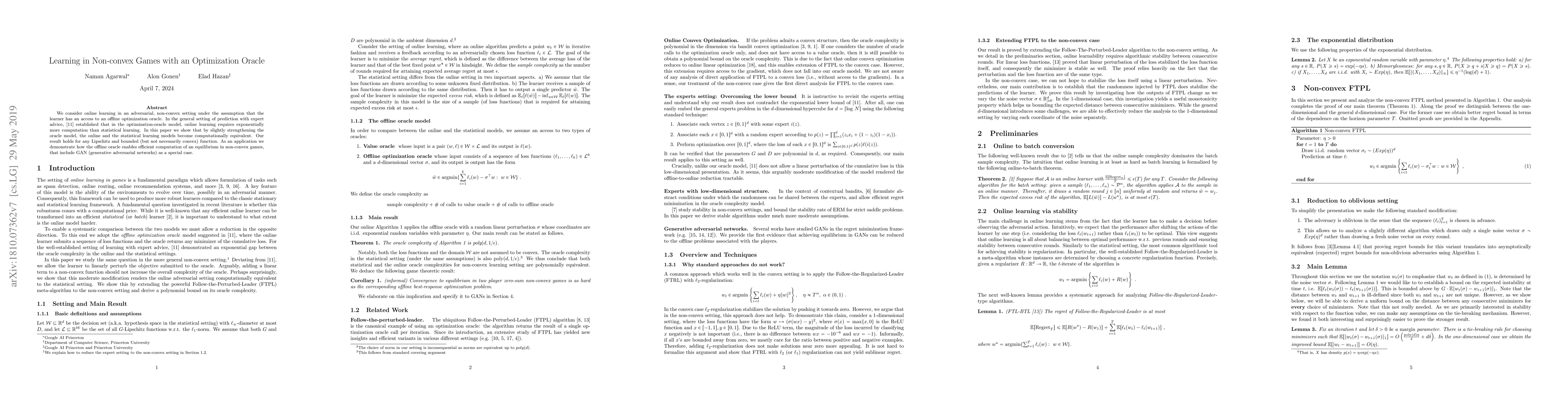 This paper demonstrates that enhancing an offline optimization oracle allows online learning in non-convex games to match the computational efficiency of statistical learning. It also shows how such an oracle can efficiently compute equilibria in non-convex games, including those involving generative adversarial networks (GANs).