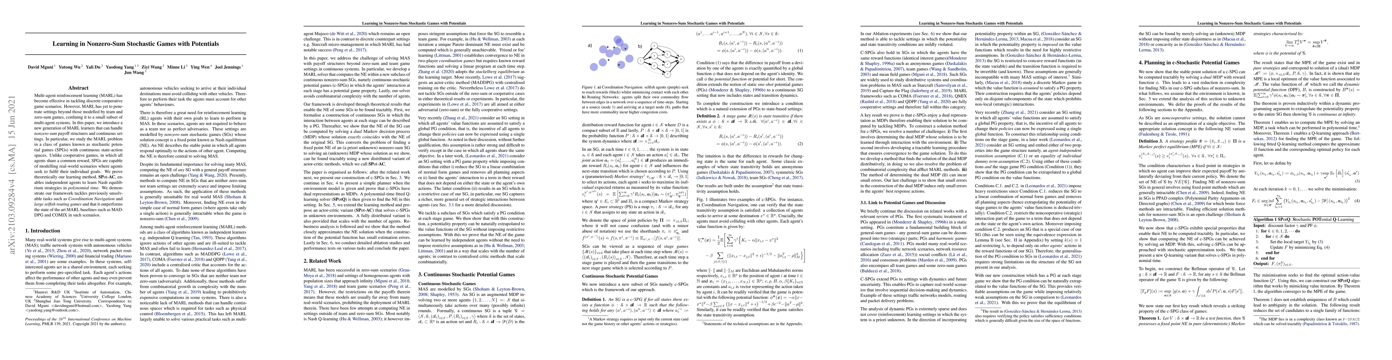 Multi-agent reinforcement learning (MARL) has become effective in tackling discrete cooperative game scenarios. However, MARL has yet to penetrate settings beyond those modelled by team and zero-sum games, confining it to a small subset of multi-agent systems. In this paper, we introduce a new generation of MARL learners that can handle nonzero-sum payoff structures and continuous settings. In particular, we study the MARL problem in a class of games known as stochastic potential games (SPGs) with continuous state-action spaces. Unlike cooperative games, in which all agents share a common reward, SPGs are capable of modelling real-world scenarios where agents seek to fulfil their individual goals. We prove theoretically our learning method, SPot-AC, enables independent agents to learn Nash equilibrium strategies in polynomial time. We demonstrate our framework tackles previously unsolvable tasks such as Coordination Navigation and large selfish routing games and that it outperforms the state of the art MARL baselines such as MADDPG and COMIX in such scenarios.