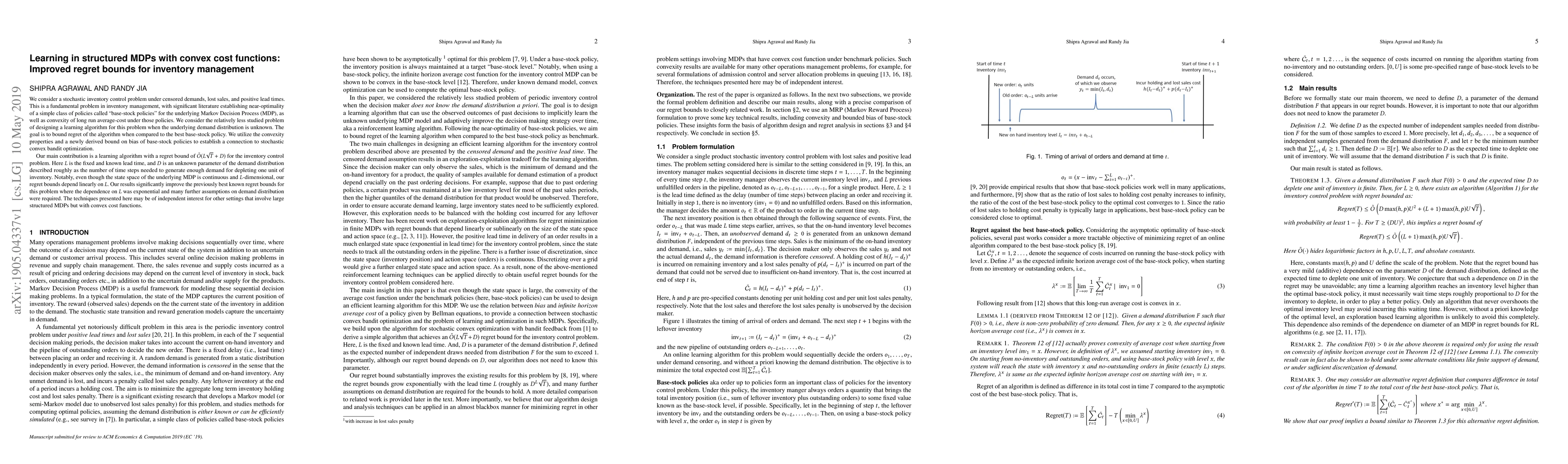 This paper introduces a learning algorithm for inventory management with improved regret bounds that depend linearly on lead time, outperforming previous results.