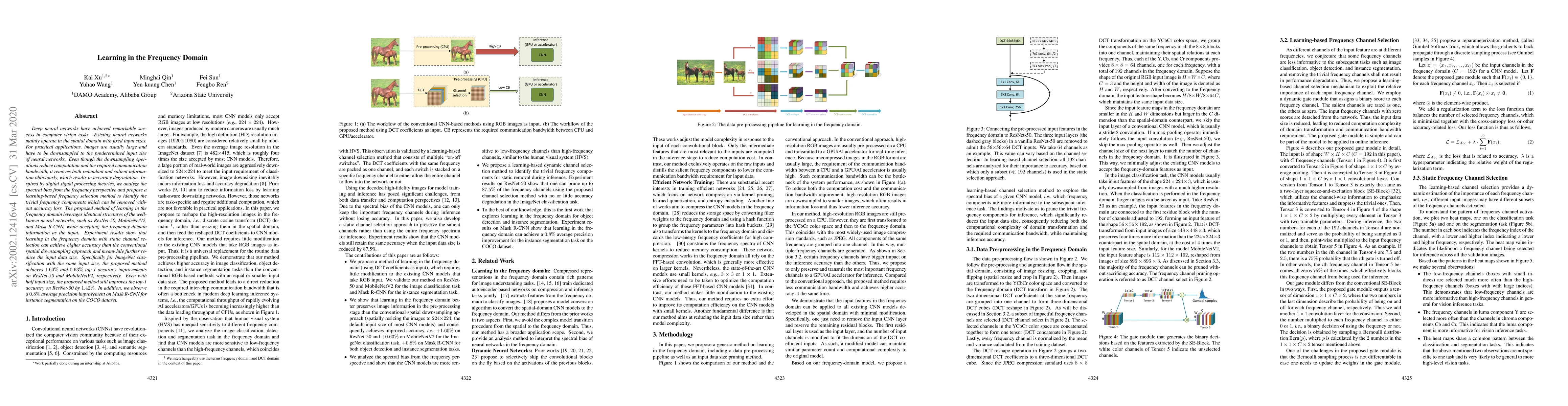 Deep neural networks have achieved remarkable success in computer vision tasks. Existing neural networks mainly operate in the spatial domain with fixed input sizes. For practical applications, images are usually large and have to be downsampled to the predetermined input size of neural networks. Even though the downsampling operations reduce computation and the required communication bandwidth, it removes both redundant and salient information obliviously, which results in accuracy degradation. Inspired by digital signal processing theories, we analyze the spectral bias from the frequency perspective and propose a learning-based frequency selection method to identify the trivial frequency components which can be removed without accuracy loss. The proposed method of learning in the frequency domain leverages identical structures of the well-known neural networks, such as ResNet-50, MobileNetV2, and Mask R-CNN, while accepting the frequency-domain information as the input. Experiment results show that learning in the frequency domain with static channel selection can achieve higher accuracy than the conventional spatial downsampling approach and meanwhile further reduce the input data size. Specifically for ImageNet classification with the same input size, the proposed method achieves 1.41% and 0.66% top-1 accuracy improvements on ResNet-50 and MobileNetV2, respectively. Even with half input size, the proposed method still improves the top-1 accuracy on ResNet-50 by 1%. In addition, we observe a 0.8% average precision improvement on Mask R-CNN for instance segmentation on the COCO dataset.