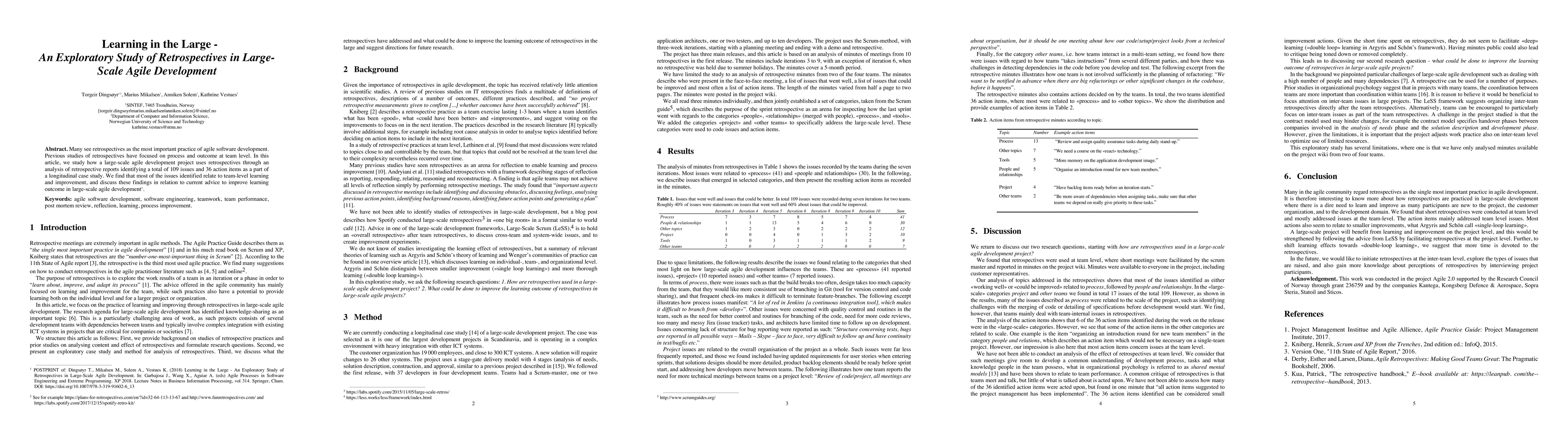 This study explores retrospectives in large-scale agile development, identifying 109 issues and 36 action items from retrospective reports. Most issues relate to team-level learning and improvement, providing insights into enhancing learning outcomes in large-scale agile projects.