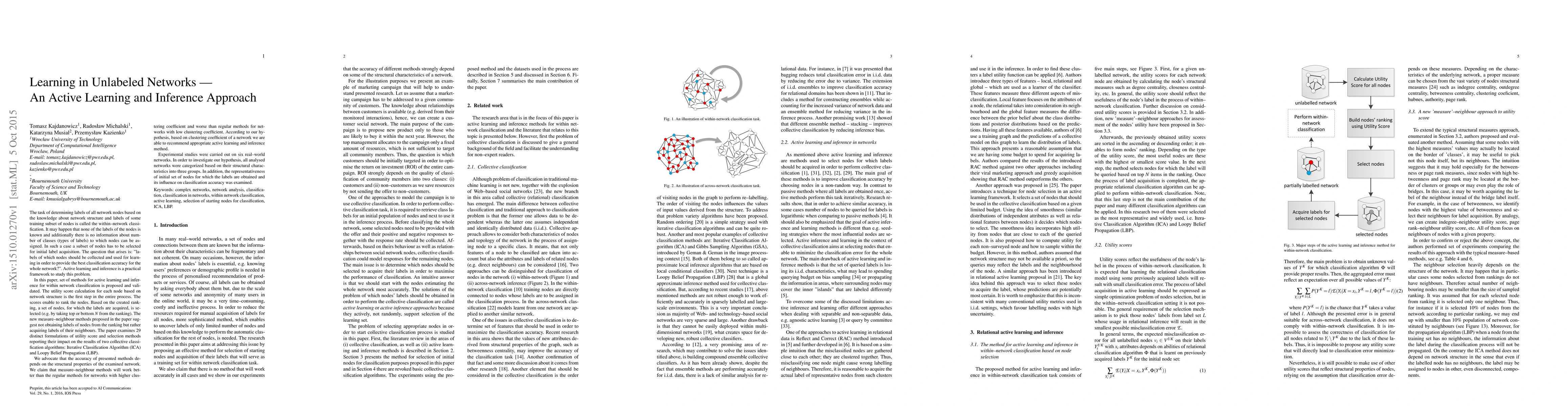 The task of determining labels of all network nodes based on the knowledge about network structure and labels of some training subset of nodes is called the within-network classification. It may happen that none of the labels of the nodes is known and additionally there is no information about number of classes to which nodes can be assigned. In such a case a subset of nodes has to be selected for initial label acquisition. The question that arises is: "labels of which nodes should be collected and used for learning in order to provide the best classification accuracy for the whole network?". Active learning and inference is a practical framework to study this problem. A set of methods for active learning and inference for within network classification is proposed and validated. The utility score calculation for each node based on network structure is the first step in the process. The scores enable to rank the nodes. Based on the ranking, a set of nodes, for which the labels are acquired, is selected (e.g. by taking top or bottom N from the ranking). The new measure-neighbour methods proposed in the paper suggest not obtaining labels of nodes from the ranking but rather acquiring labels of their neighbours. The paper examines 29 distinct formulations of utility score and selection methods reporting their impact on the results of two collective classification algorithms: Iterative Classification Algorithm and Loopy Belief Propagation. We advocate that the accuracy of presented methods depends on the structural properties of the examined network. We claim that measure-neighbour methods will work better than the regular methods for networks with higher clustering coefficient and worse than regular methods for networks with low clustering coefficient. According to our hypothesis, based on clustering coefficient we are able to recommend appropriate active learning and inference method.