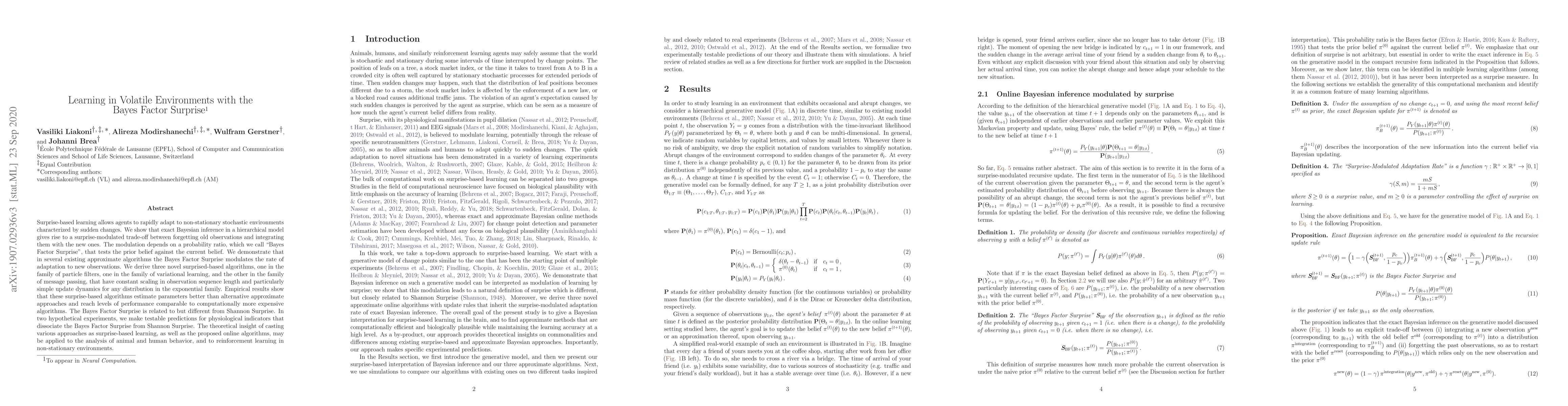This paper proposes the Bayes Factor Surprise as a mechanism for adaptive learning in volatile environments, demonstrating its role in modulating the balance between forgetting old data and integrating new information. The authors develop three novel surprise-based algorithms with efficient update dynamics, showing they outperform alternative methods in parameter estimation.