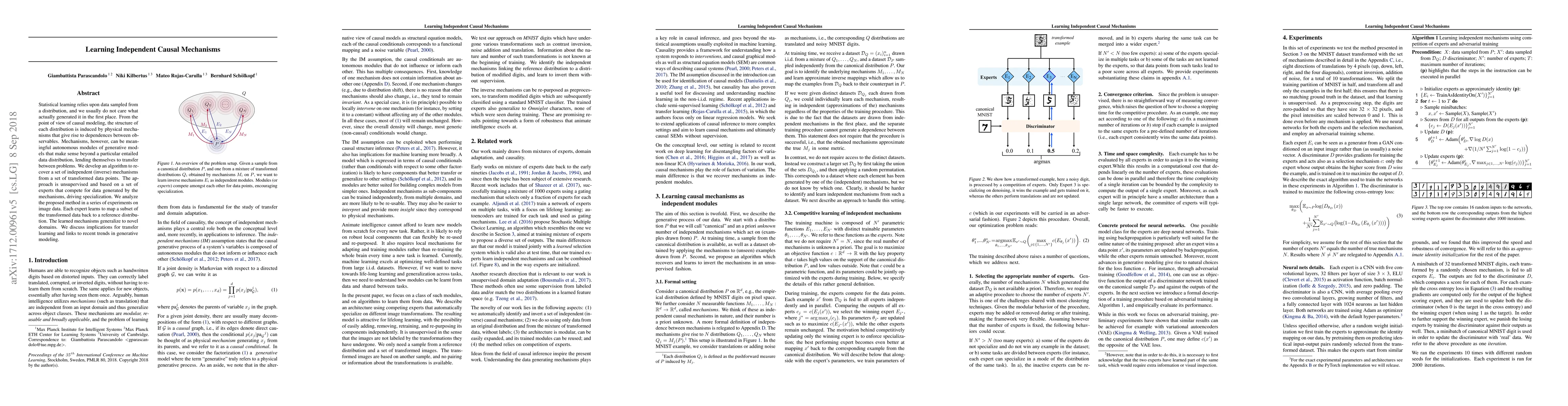 This paper proposes an unsupervised algorithm to recover independent causal mechanisms from transformed data. The method uses competing experts to specialize in mapping subsets of data, demonstrating generalization to novel domains and implications for transfer learning.