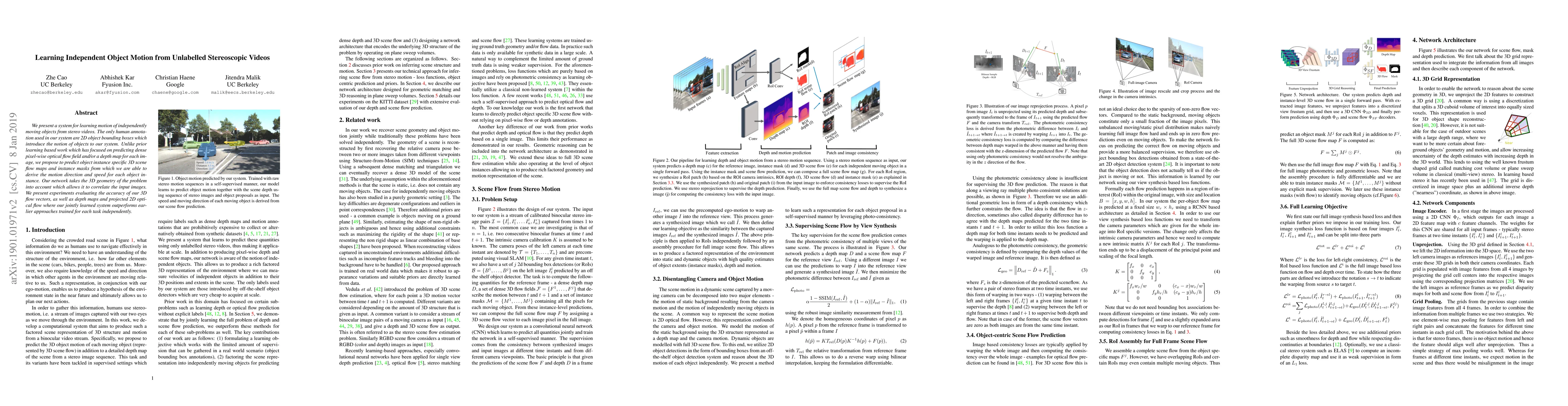This paper proposes a system to learn independent object motion from unlabelled stereoscopic videos using only 2D bounding boxes as input. It predicts object-specific 3D scene flow maps and instance masks, outperforming previous methods that predict dense optical flow or depth maps independently.