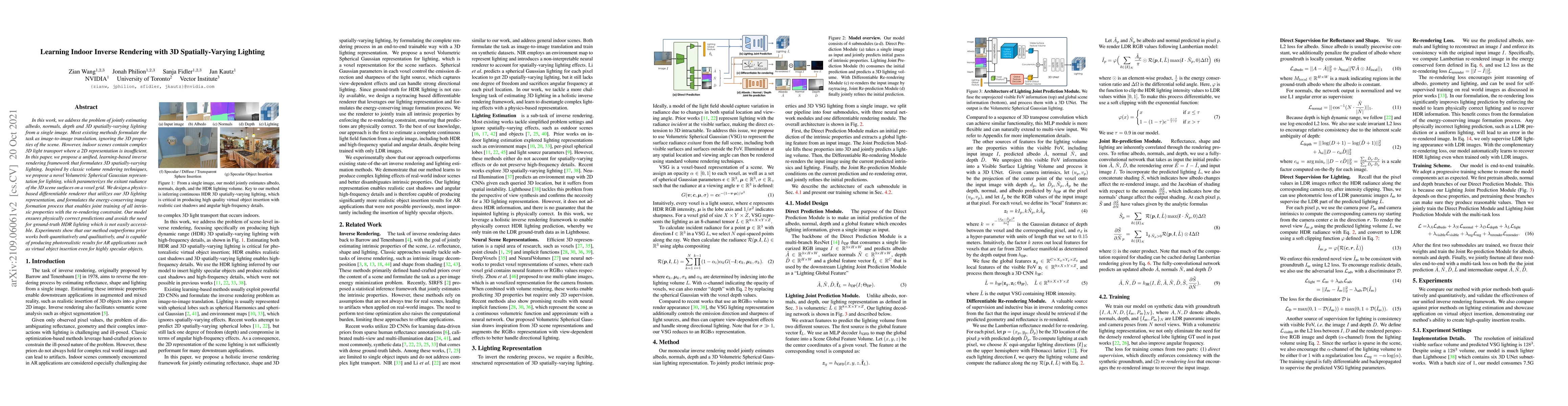 This paper proposes a learning-based inverse rendering framework to estimate albedo, normals, depth, and 3D spatially-varying lighting from a single image. The method introduces a Volumetric Spherical Gaussian representation for lighting and a differentiable renderer to model complex 3D light transport, achieving superior results in AR applications.