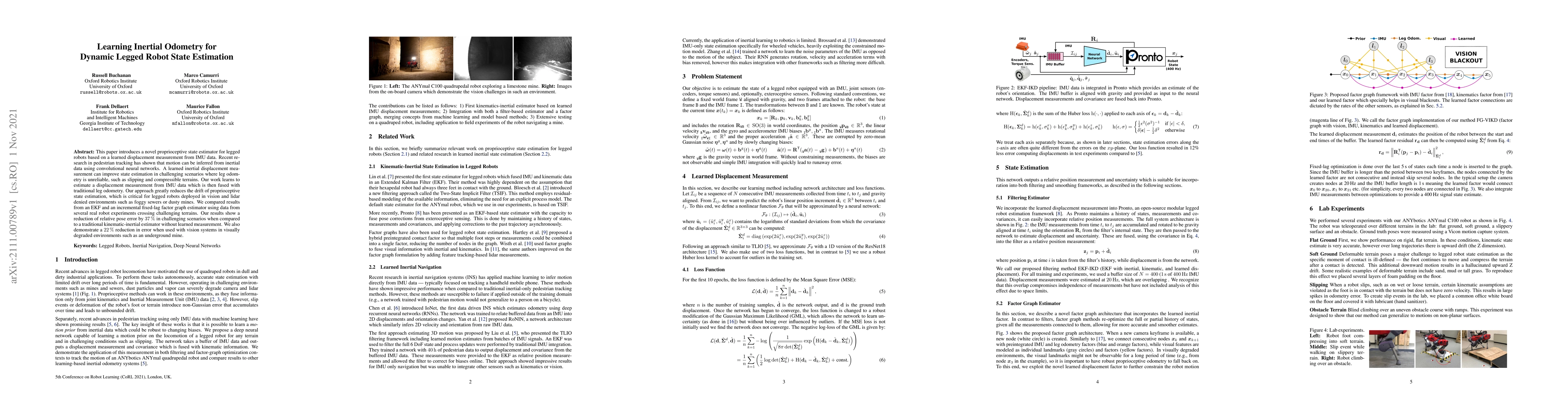 This paper proposes a novel state estimator for legged robots that leverages convolutional neural networks to learn inertial displacement from IMU data, improving state estimation in challenging terrains. The approach significantly reduces state estimation drift, achieving a 37% reduction in pose error in difficult conditions compared to traditional methods.