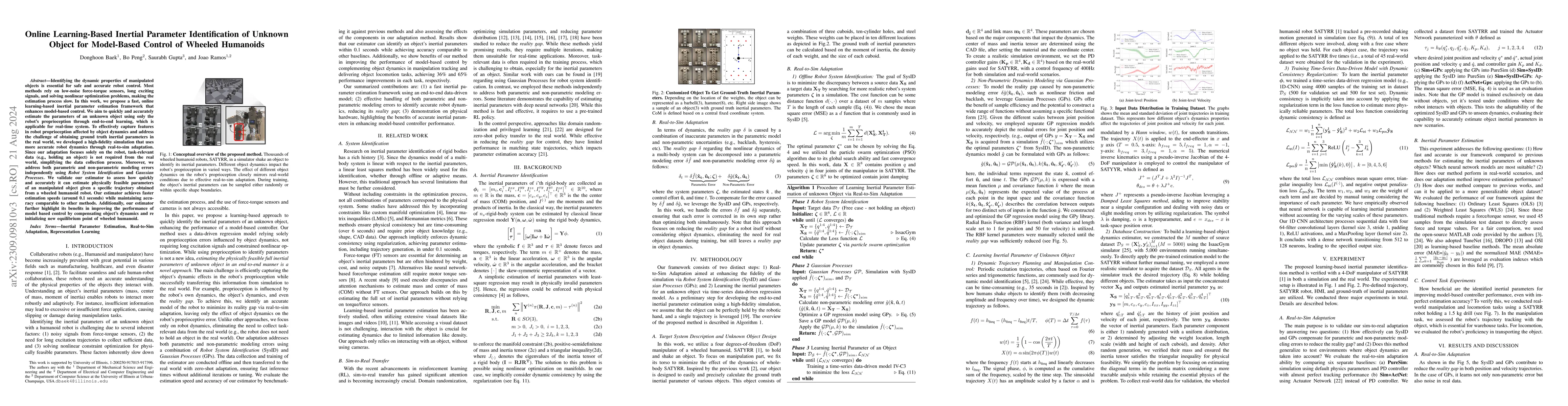 This research presents a learning-based framework for fast inertial parameter estimation of unknown objects using a humanoid robot, leveraging real-to-sim adaptation to generate a reliable dataset for training. The method utilizes a time-series data-driven regression model instead of traditional optimization, demonstrating quick and accurate parameter identification in a 4-DOF manipulator scenario.