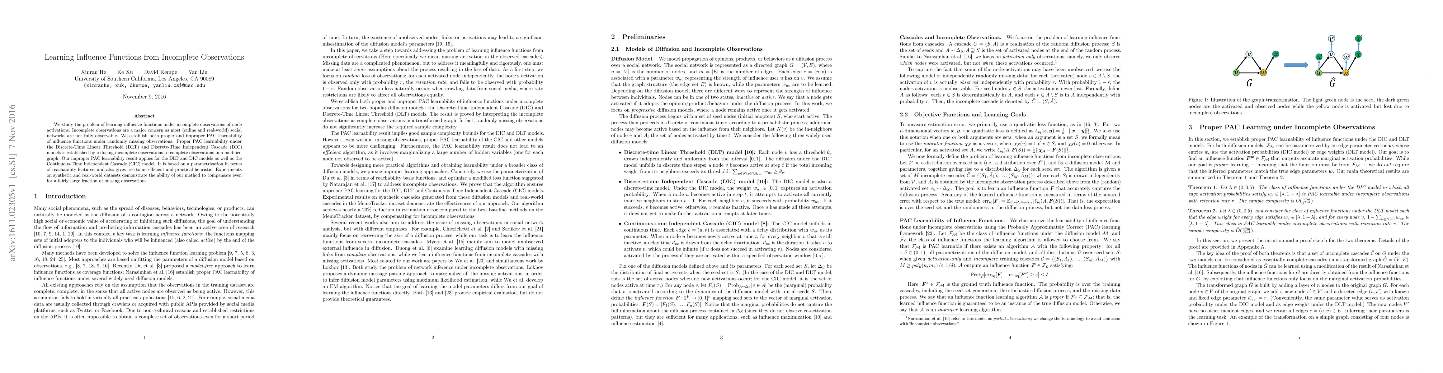 This paper investigates learning influence functions from incomplete node activation observations in social networks, establishing both proper and improper PAC learnability under missing data scenarios. It proposes a modified graph approach for proper learnability and a heuristic based on reachability features for improper learnability, validated by experiments on synthetic and real datasets.