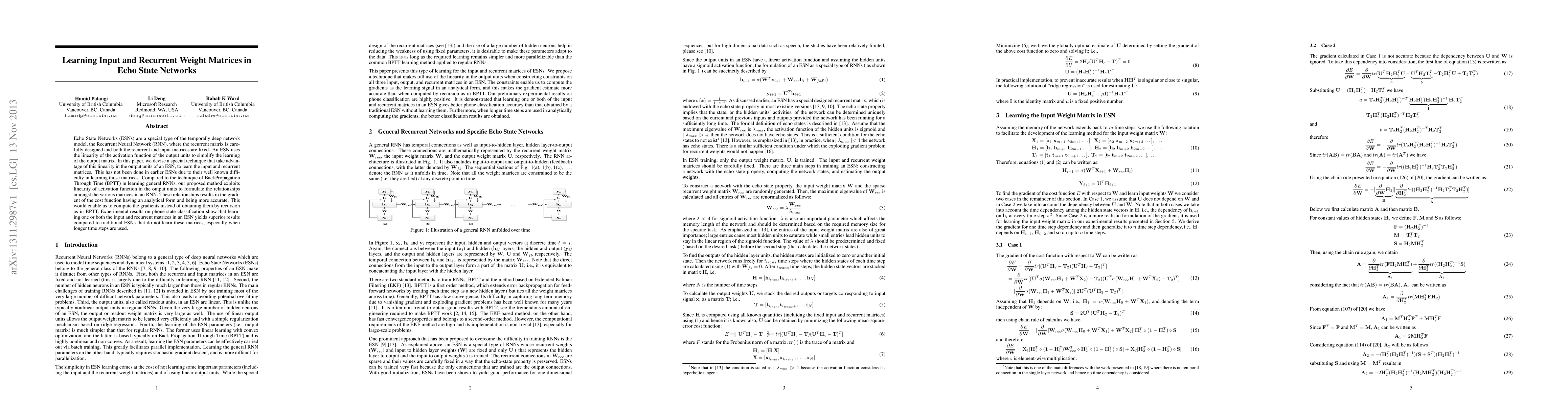 Echo State Networks (ESNs) are a special type of the temporally deep network model, the Recurrent Neural Network (RNN), where the recurrent matrix is carefully designed and both the recurrent and input matrices are fixed. An ESN uses the linearity of the activation function of the output units to simplify the learning of the output matrix. In this paper, we devise a special technique that take advantage of this linearity in the output units of an ESN, to learn the input and recurrent matrices. This has not been done in earlier ESNs due to their well known difficulty in learning those matrices. Compared to the technique of BackPropagation Through Time (BPTT) in learning general RNNs, our proposed method exploits linearity of activation function in the output units to formulate the relationships amongst the various matrices in an RNN. These relationships results in the gradient of the cost function having an analytical form and being more accurate. This would enable us to compute the gradients instead of obtaining them by recursion as in BPTT. Experimental results on phone state classification show that learning one or both the input and recurrent matrices in an ESN yields superior results compared to traditional ESNs that do not learn these matrices, especially when longer time steps are used.