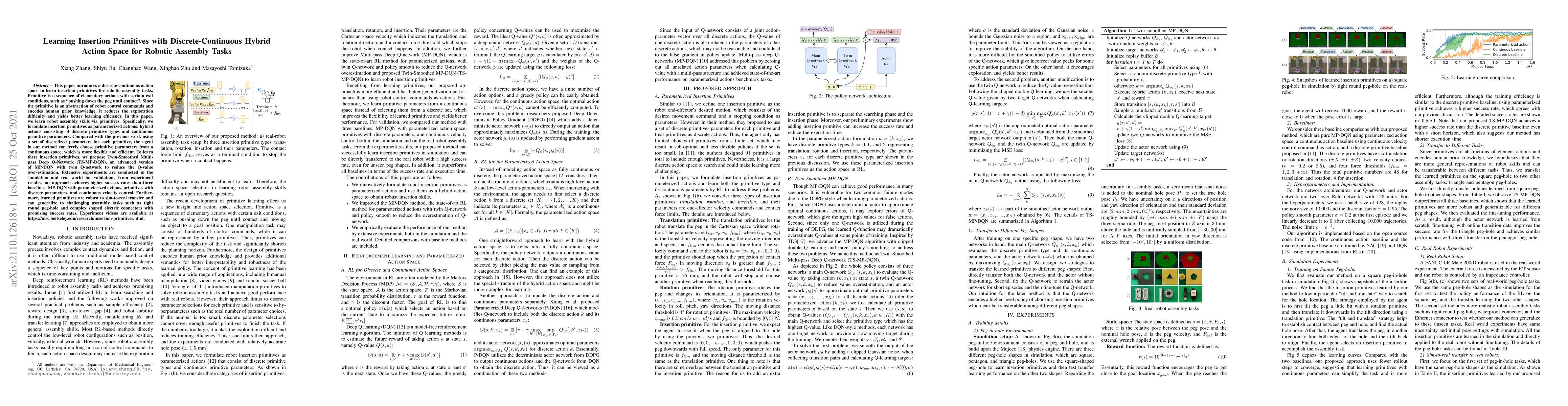 This paper introduces a hybrid discrete-continuous action space to learn insertion primitives for robotic assembly tasks, utilizing parameterized actions for flexibility. The proposed Twin-Smoothed Multi-pass Deep Q-Network (TS-MP-DQN) achieves higher success rates and sim-to-real robustness compared to baselines, effectively generalizing to complex assembly tasks.
