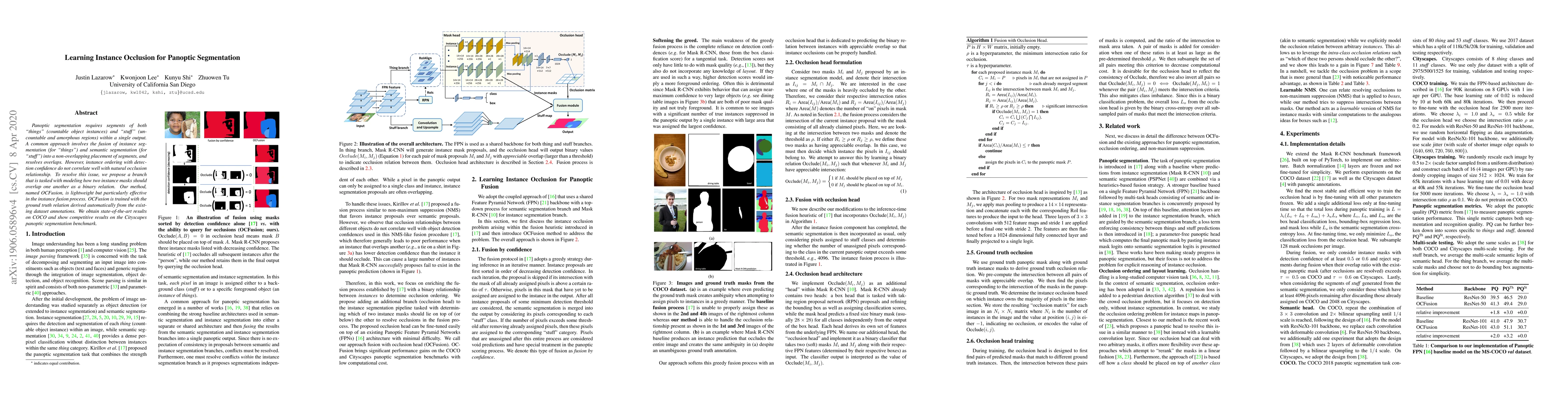 The paper proposes OCFusion, a lightweight method to model instance occlusion in panoptic segmentation, improving the fusion of instance and semantic segmentation. OCFusion achieves state-of-the-art results on COCO and competitive results on Cityscapes by resolving instance overlaps based on occlusion relations.