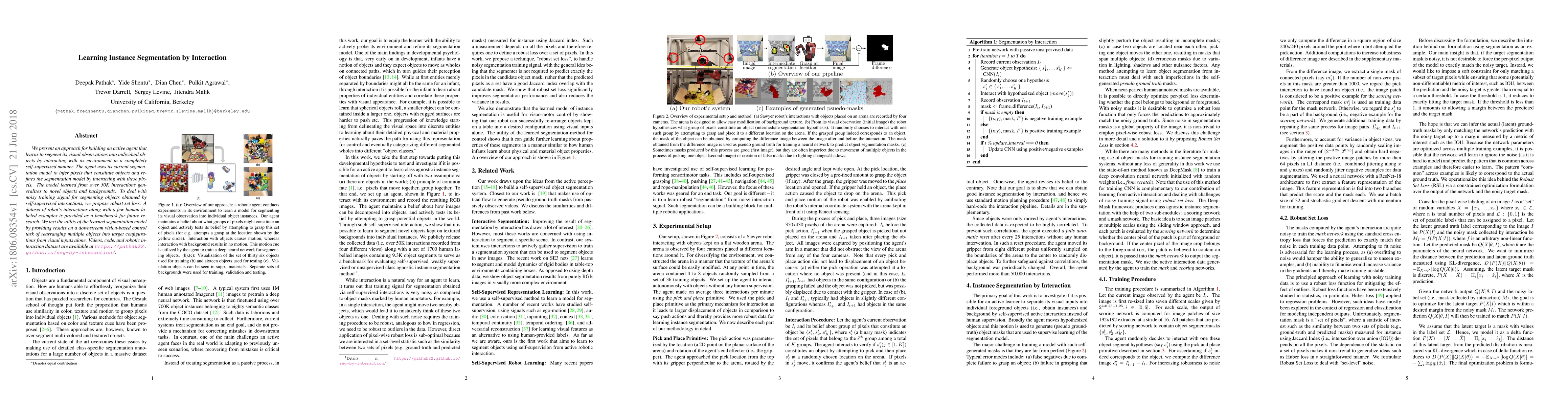 We present an approach for building an active agent that learns to segment its visual observations into individual objects by interacting with its environment in a completely self-supervised manner. The agent uses its current segmentation model to infer pixels that constitute objects and refines the segmentation model by interacting with these pixels. The model learned from over 50K interactions generalizes to novel objects and backgrounds. To deal with noisy training signal for segmenting objects obtained by self-supervised interactions, we propose robust set loss. A dataset of robot's interactions along-with a few human labeled examples is provided as a benchmark for future research. We test the utility of the learned segmentation model by providing results on a downstream vision-based control task of rearranging multiple objects into target configurations from visual inputs alone. Videos, code, and robotic interaction dataset are available at https://pathak22.github.io/seg-by-interaction/