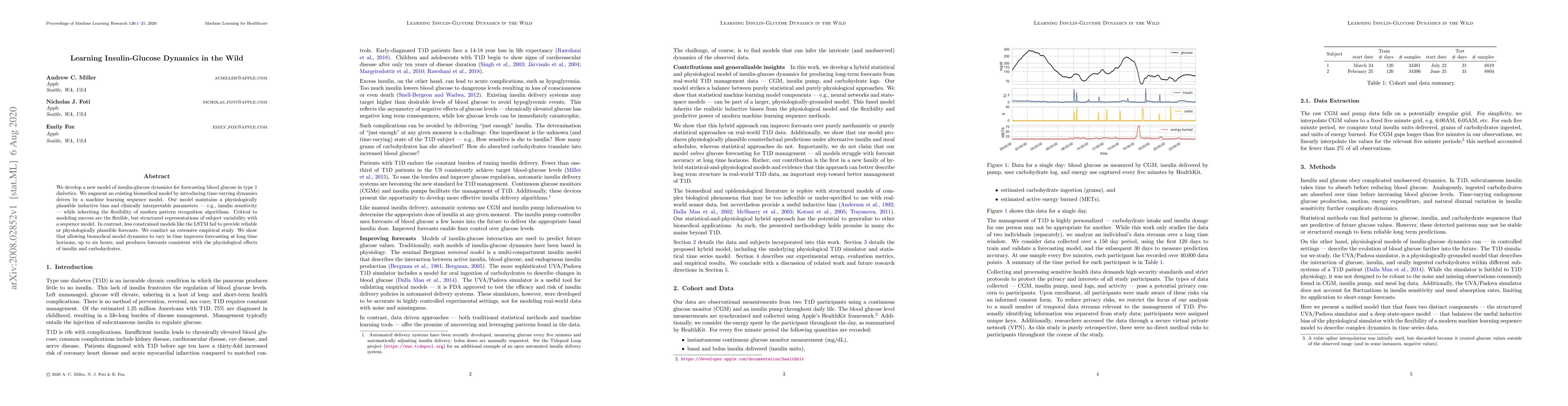 We develop a new model of insulin-glucose dynamics for forecasting blood glucose in type 1 diabetics. We augment an existing biomedical model by introducing time-varying dynamics driven by a machine learning sequence model. Our model maintains a physiologically plausible inductive bias and clinically interpretable parameters -- e.g., insulin sensitivity -- while inheriting the flexibility of modern pattern recognition algorithms. Critical to modeling success are the flexible, but structured representations of subject variability with a sequence model. In contrast, less constrained models like the LSTM fail to provide reliable or physiologically plausible forecasts. We conduct an extensive empirical study. We show that allowing biomedical model dynamics to vary in time improves forecasting at long time horizons, up to six hours, and produces forecasts consistent with the physiological effects of insulin and carbohydrates.