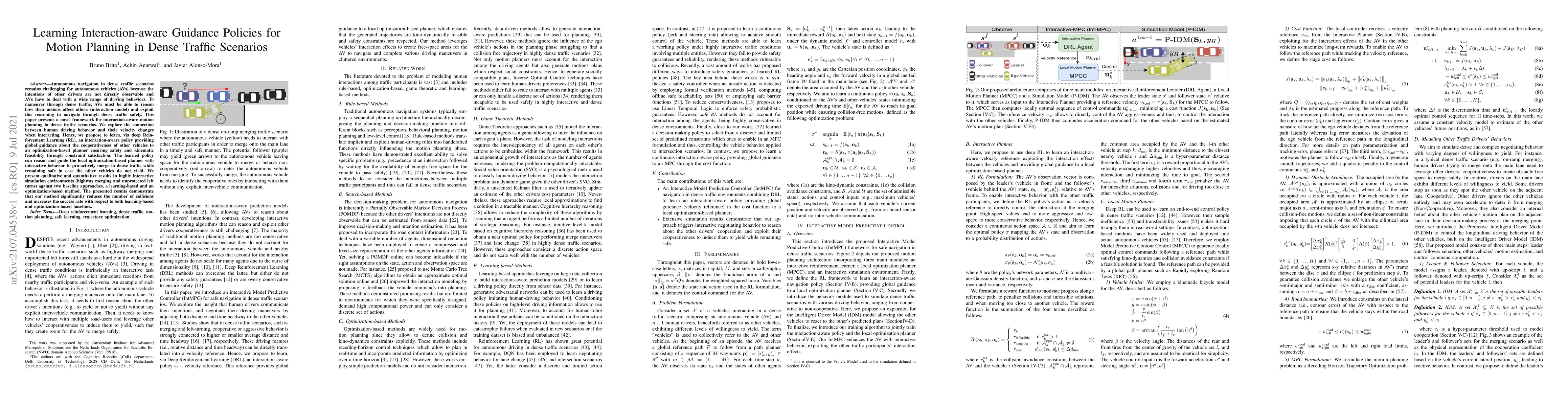 Autonomous navigation in dense traffic scenarios remains challenging for autonomous vehicles (AVs) because the intentions of other drivers are not directly observable and AVs have to deal with a wide range of driving behaviors. To maneuver through dense traffic, AVs must be able to reason how their actions affect others (interaction model) and exploit this reasoning to navigate through dense traffic safely. This paper presents a novel framework for interaction-aware motion planning in dense traffic scenarios. We explore the connection between human driving behavior and their velocity changes when interacting. Hence, we propose to learn, via deep Reinforcement Learning (RL), an interaction-aware policy providing global guidance about the cooperativeness of other vehicles to an optimization-based planner ensuring safety and kinematic feasibility through constraint satisfaction. The learned policy can reason and guide the local optimization-based planner with interactive behavior to pro-actively merge in dense traffic while remaining safe in case the other vehicles do not yield. We present qualitative and quantitative results in highly interactive simulation environments (highway merging and unprotected left turns) against two baseline approaches, a learning-based and an optimization-based method. The presented results demonstrate that our method significantly reduces the number of collisions and increases the success rate with respect to both learning-based and optimization-based baselines.