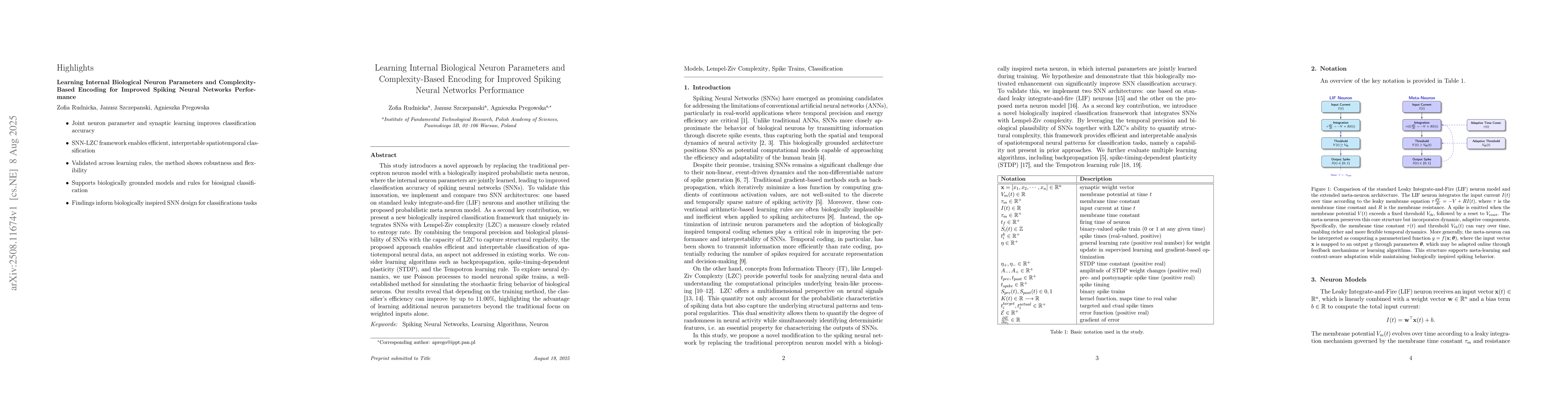 This study introduces a novel approach by replacing the traditional perceptron neuron model with a biologically inspired probabilistic meta neuron, where the internal neuron parameters are jointly learned, leading to improved classification accuracy of spiking neural networks (SNNs). To validate this innovation, we implement and compare two SNN architectures: one based on standard leaky integrate-and-fire (LIF) neurons and another utilizing the proposed probabilistic meta neuron model. As a second key contribution, we present a new biologically inspired classification framework that uniquely integrates SNNs with Lempel-Ziv complexity (LZC) a measure closely related to entropy rate. By combining the temporal precision and biological plausibility of SNNs with the capacity of LZC to capture structural regularity, the proposed approach enables efficient and interpretable classification of spatiotemporal neural data, an aspect not addressed in existing works. We consider learning algorithms such as backpropagation, spike-timing-dependent plasticity (STDP), and the Tempotron learning rule. To explore neural dynamics, we use Poisson processes to model neuronal spike trains, a well-established method for simulating the stochastic firing behavior of biological neurons. Our results reveal that depending on the training method, the classifier's efficiency can improve by up to 11.00%, highlighting the advantage of learning additional neuron parameters beyond the traditional focus on weighted inputs alone.
