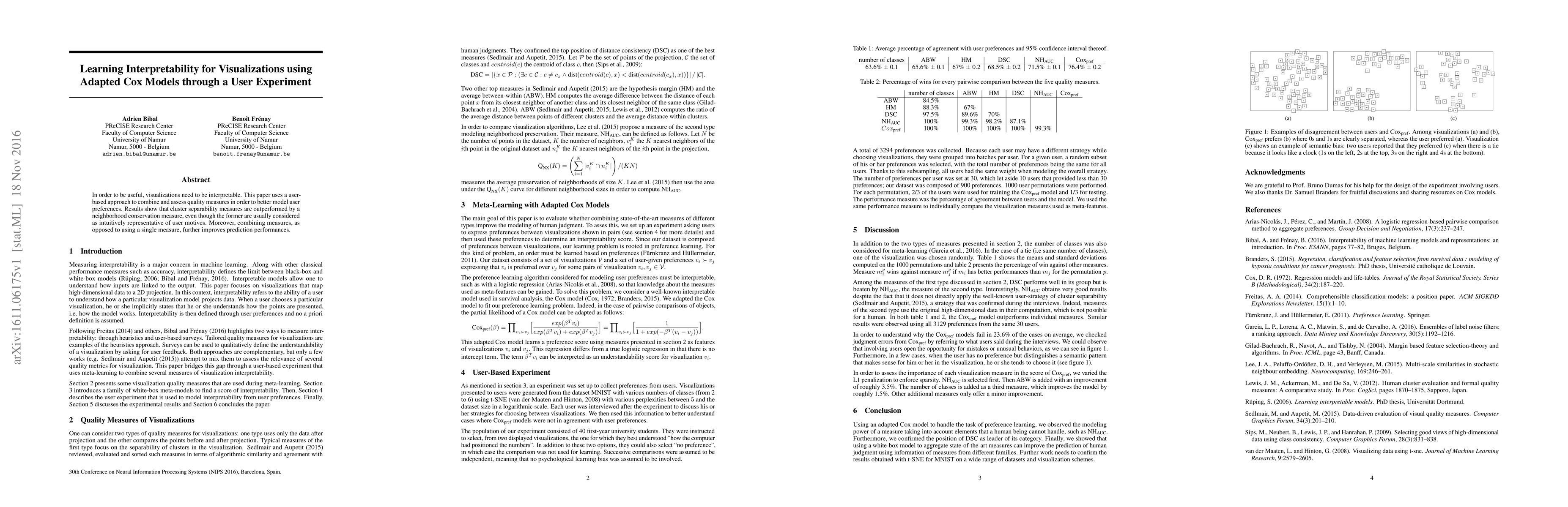 This paper employs a user experiment to evaluate visualization interpretability, finding that neighborhood conservation measures outperform cluster separability, and that combining multiple measures improves prediction performance over single measures.