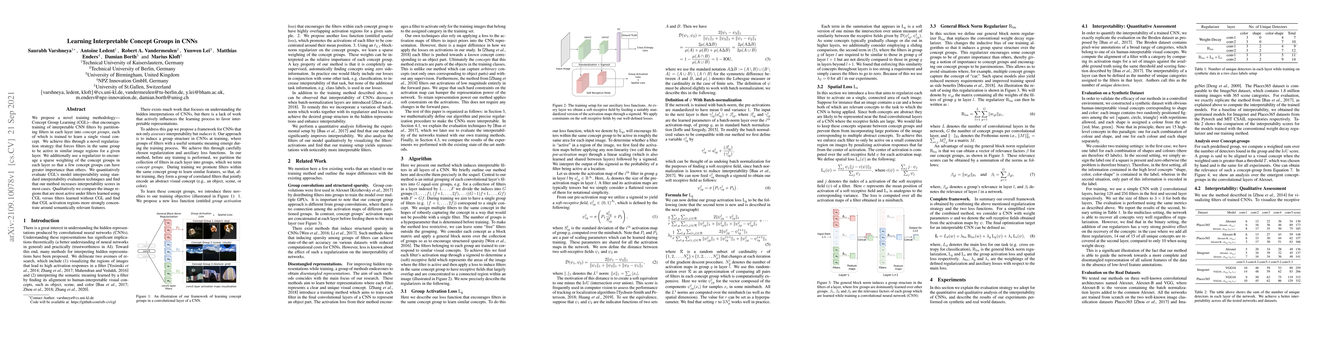 We propose a novel training methodology -- Concept Group Learning (CGL) -- that encourages training of interpretable CNN filters by partitioning filters in each layer into concept groups, each of which is trained to learn a single visual concept. We achieve this through a novel regularization strategy that forces filters in the same group to be active in similar image regions for a given layer. We additionally use a regularizer to encourage a sparse weighting of the concept groups in each layer so that a few concept groups can have greater importance than others. We quantitatively evaluate CGL's model interpretability using standard interpretability evaluation techniques and find that our method increases interpretability scores in most cases. Qualitatively we compare the image regions that are most active under filters learned using CGL versus filters learned without CGL and find that CGL activation regions more strongly concentrate around semantically relevant features.