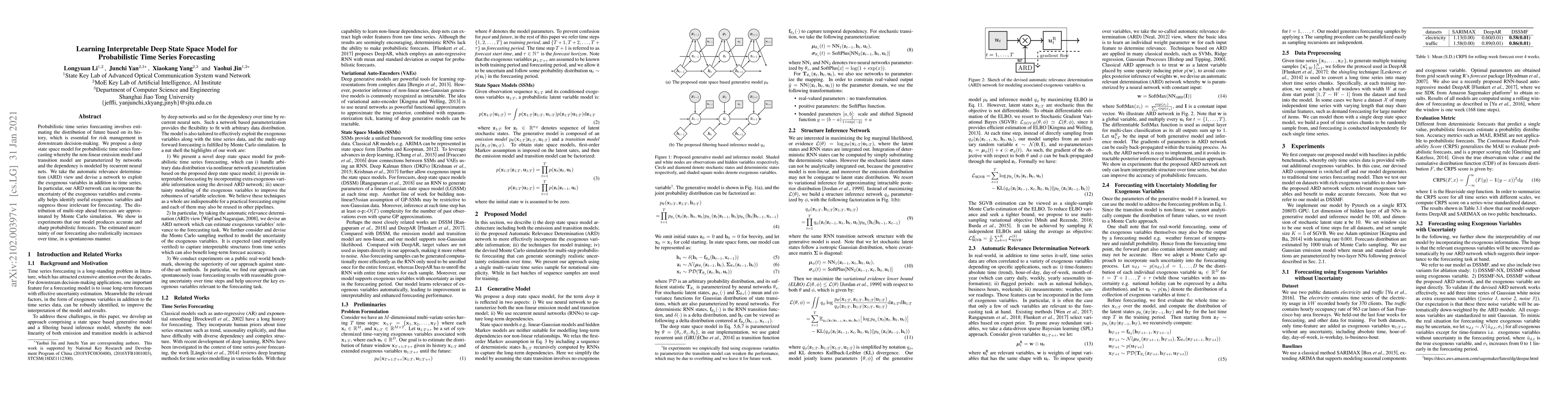 This paper proposes a deep state space model for probabilistic time series forecasting, utilizing neural networks for non-linear emission and transition models, and recurrent neural networks to model dependencies. The model incorporates exogenous variables through an automatic relevance determination network, which helps identify useful variables and suppress irrelevant ones, enhancing forecast accuracy and uncertainty estimation.