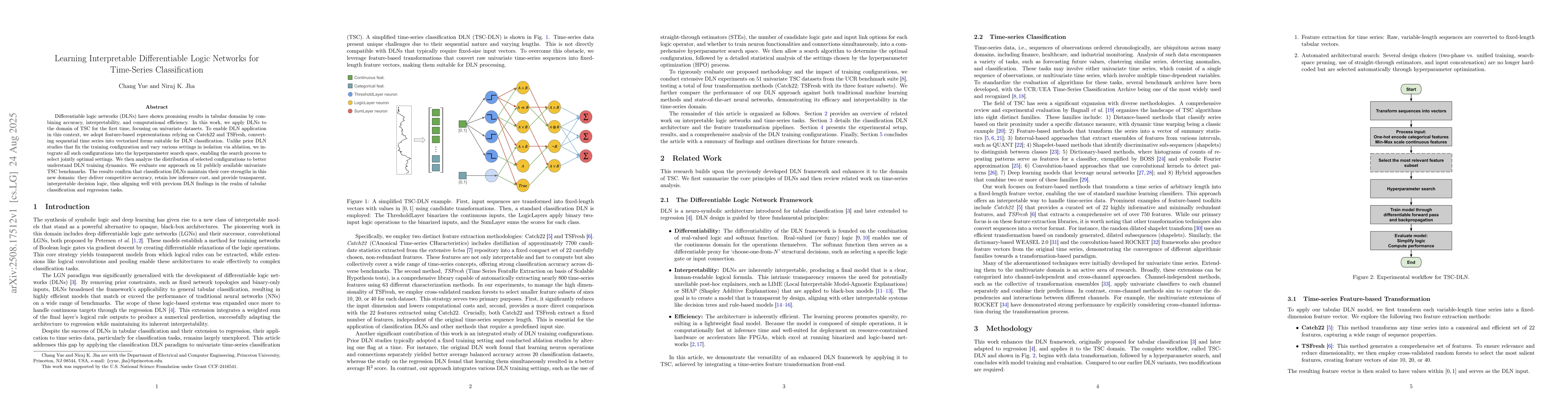 Differentiable logic networks (DLNs) have shown promising results in tabular domains by combining accuracy, interpretability, and computational efficiency. In this work, we apply DLNs to the domain of TSC for the first time, focusing on univariate datasets. To enable DLN application in this context, we adopt feature-based representations relying on Catch22 and TSFresh, converting sequential time series into vectorized forms suitable for DLN classification. Unlike prior DLN studies that fix the training configuration and vary various settings in isolation via ablation, we integrate all such configurations into the hyperparameter search space, enabling the search process to select jointly optimal settings. We then analyze the distribution of selected configurations to better understand DLN training dynamics. We evaluate our approach on 51 publicly available univariate TSC benchmarks. The results confirm that classification DLNs maintain their core strengths in this new domain: they deliver competitive accuracy, retain low inference cost, and provide transparent, interpretable decision logic, thus aligning well with previous DLN findings in the realm of tabular classification and regression tasks.