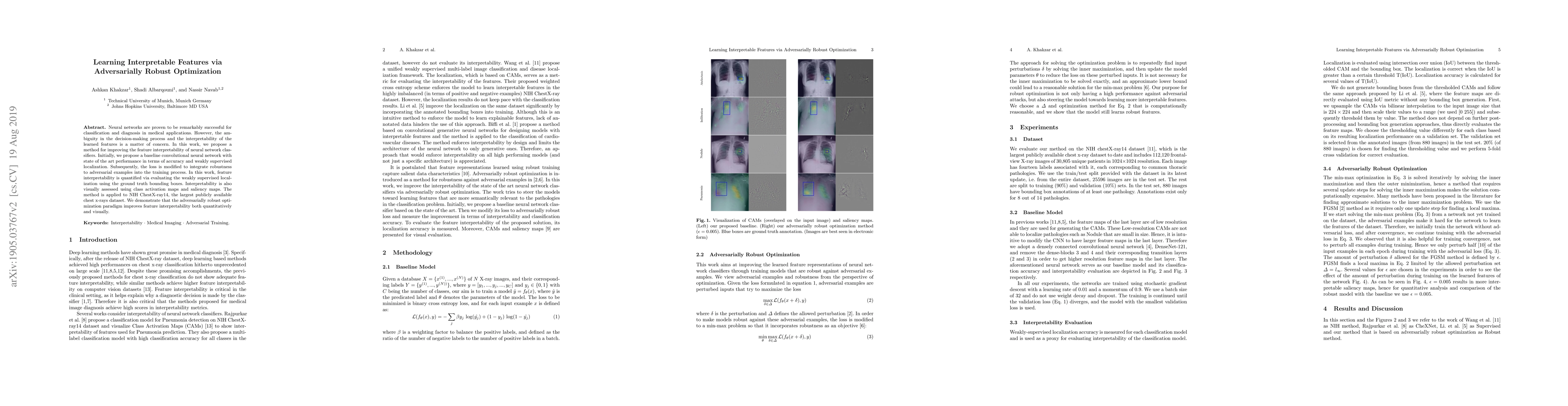 Neural networks are proven to be remarkably successful for classification and diagnosis in medical applications. However, the ambiguity in the decision-making process and the interpretability of the learned features is a matter of concern. In this work, we propose a method for improving the feature interpretability of neural network classifiers. Initially, we propose a baseline convolutional neural network with state of the art performance in terms of accuracy and weakly supervised localization. Subsequently, the loss is modified to integrate robustness to adversarial examples into the training process. In this work, feature interpretability is quantified via evaluating the weakly supervised localization using the ground truth bounding boxes. Interpretability is also visually assessed using class activation maps and saliency maps. The method is applied to NIH ChestX-ray14, the largest publicly available chest x-rays dataset. We demonstrate that the adversarially robust optimization paradigm improves feature interpretability both quantitatively and visually.