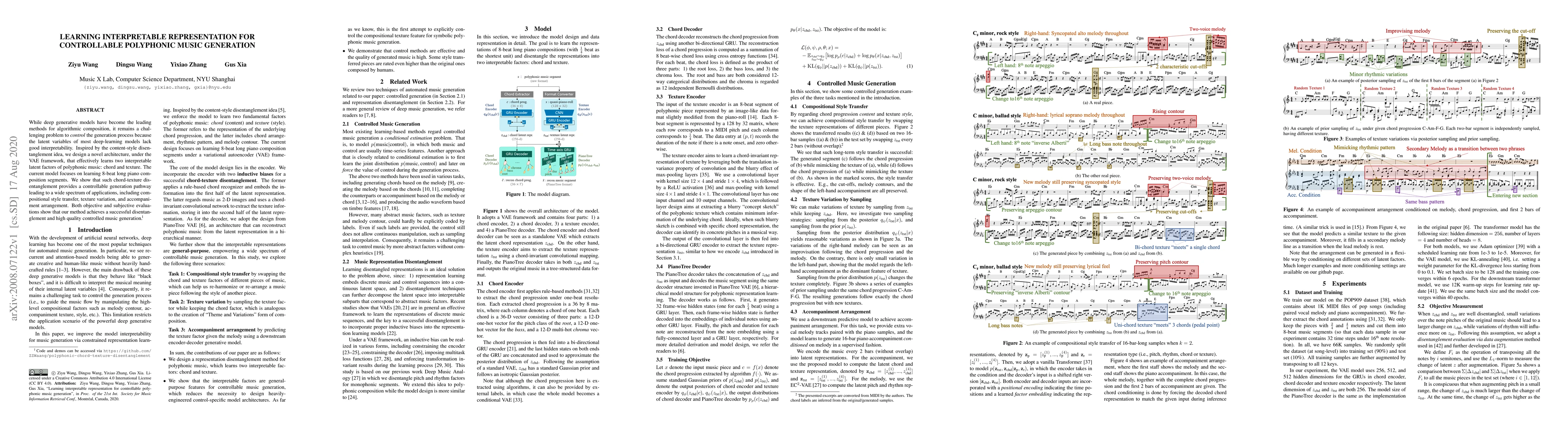 The paper introduces a novel VAE-based architecture for learning interpretable chord and texture representations of polyphonic music, enabling controlled generation with applications in style transfer, texture variation, and accompaniment arrangement.