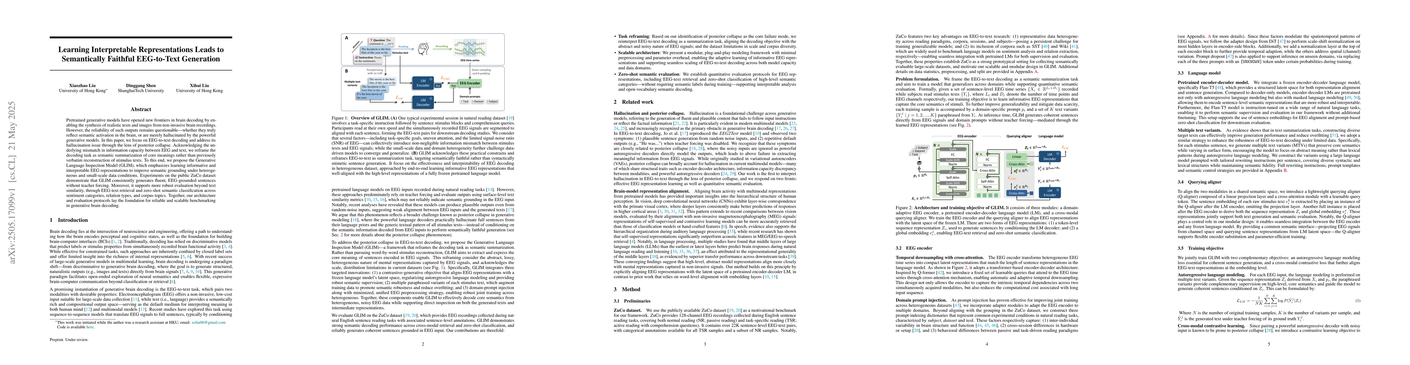 The main technical contribution is the Generative Language Inspection Model (GLIM), which focuses on learning interpretable EEG representations for semantically faithful text generation.