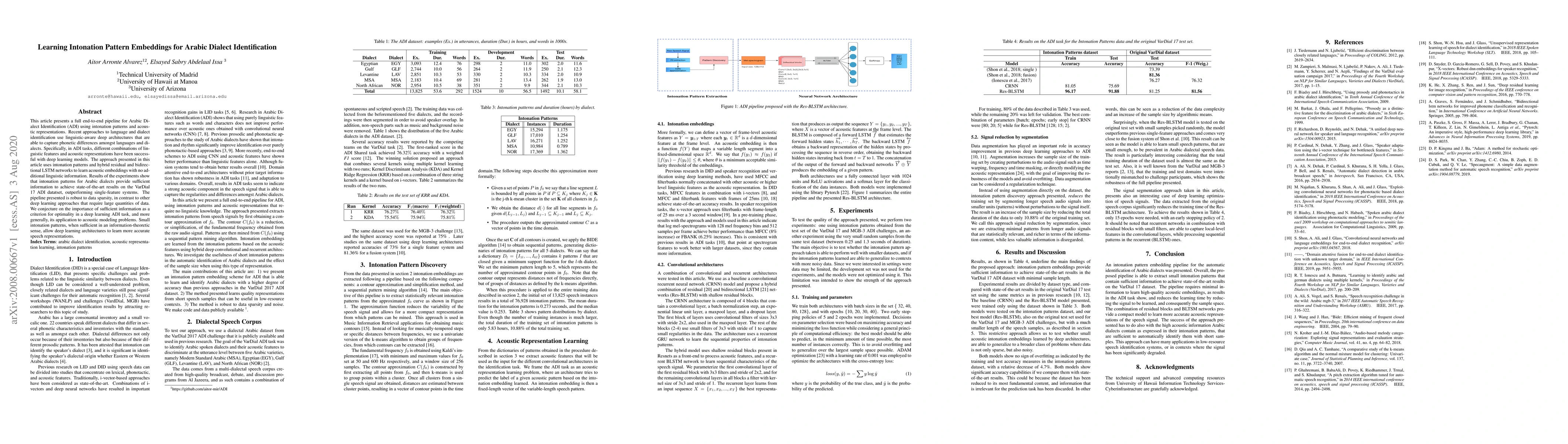 This article presents a full end-to-end pipeline for Arabic Dialect Identification (ADI) using intonation patterns and acoustic representations. Recent approaches to language and dialect identification use linguistic-aware deep architectures that are able to capture phonetic differences amongst languages and dialects. Specifically, in ADI tasks, different combinations of linguistic features and acoustic representations have been successful with deep learning models. The approach presented in this article uses intonation patterns and hybrid residual and bidirectional LSTM networks to learn acoustic embeddings with no additional linguistic information. Results of the experiments show that intonation patterns for Arabic dialects provide sufficient information to achieve state-of-the-art results on the VarDial 17 ADI dataset, outperforming single-feature systems. The pipeline presented is robust to data sparsity, in contrast to other deep learning approaches that require large quantities of data. We conjecture on the importance of sufficient information as a criterion for optimality in a deep learning ADI task, and more generally, its application to acoustic modeling problems. Small intonation patterns, when sufficient in an information-theoretic sense, allow deep learning architectures to learn more accurate speech representations.