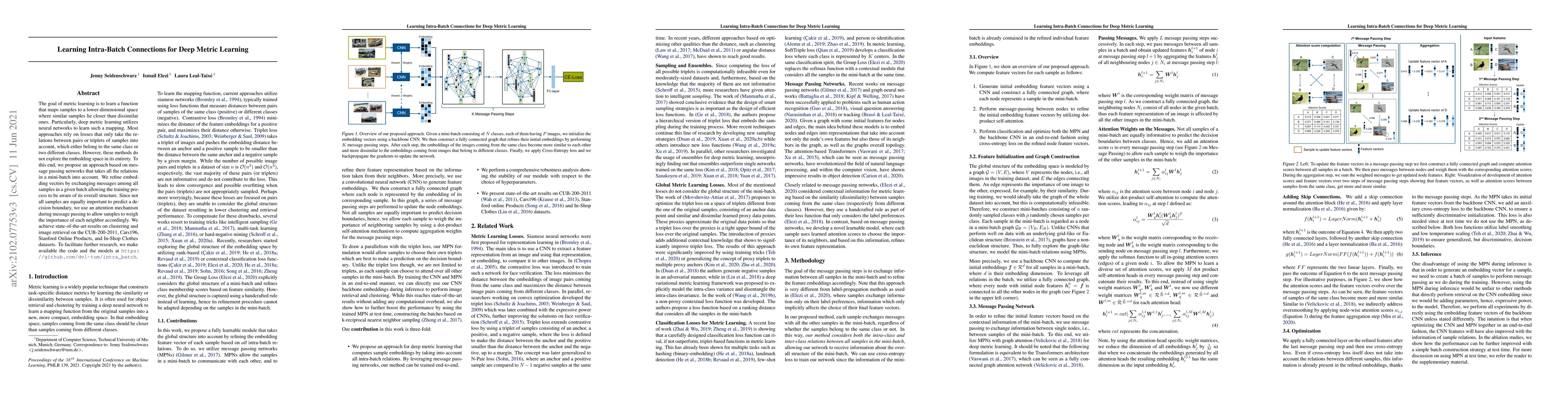 The goal of metric learning is to learn a function that maps samples to a lower-dimensional space where similar samples lie closer than dissimilar ones. Particularly, deep metric learning utilizes neural networks to learn such a mapping. Most approaches rely on losses that only take the relations between pairs or triplets of samples into account, which either belong to the same class or two different classes. However, these methods do not explore the embedding space in its entirety. To this end, we propose an approach based on message passing networks that takes all the relations in a mini-batch into account. We refine embedding vectors by exchanging messages among all samples in a given batch allowing the training process to be aware of its overall structure. Since not all samples are equally important to predict a decision boundary, we use an attention mechanism during message passing to allow samples to weigh the importance of each neighbor accordingly. We achieve state-of-the-art results on clustering and image retrieval on the CUB-200-2011, Cars196, Stanford Online Products, and In-Shop Clothes datasets. To facilitate further research, we make available the code and the models at https://github.com/dvl-tum/intra_batch_connections.