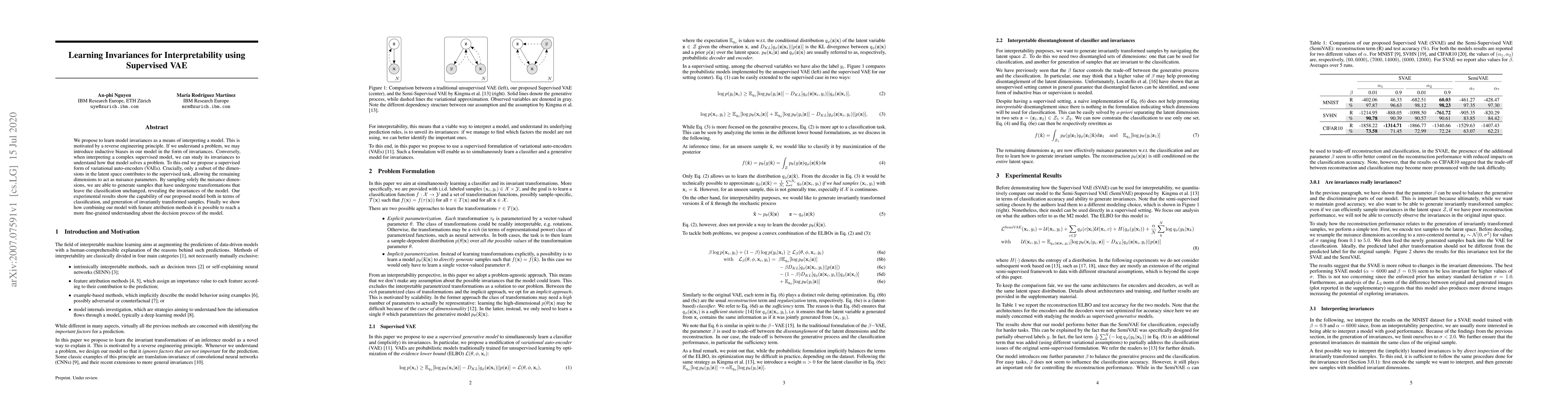 We propose to learn model invariances as a means of interpreting a model. This is motivated by a reverse engineering principle. If we understand a problem, we may introduce inductive biases in our model in the form of invariances. Conversely, when interpreting a complex supervised model, we can study its invariances to understand how that model solves a problem. To this end we propose a supervised form of variational auto-encoders (VAEs). Crucially, only a subset of the dimensions in the latent space contributes to the supervised task, allowing the remaining dimensions to act as nuisance parameters. By sampling solely the nuisance dimensions, we are able to generate samples that have undergone transformations that leave the classification unchanged, revealing the invariances of the model. Our experimental results show the capability of our proposed model both in terms of classification, and generation of invariantly transformed samples. Finally we show how combining our model with feature attribution methods it is possible to reach a more fine-grained understanding about the decision process of the model.