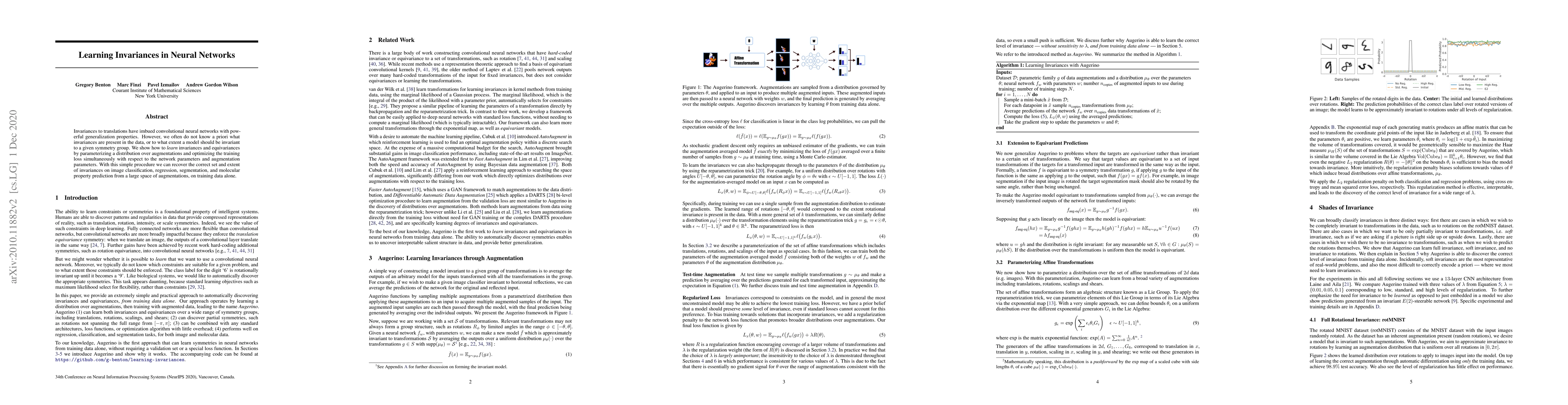 This paper proposes a method to learn invariances and equivariances in neural networks by parameterizing a distribution over data augmentations and optimizing both the network and augmentation parameters simultaneously. This approach enables the recovery of appropriate invariances for various tasks without prior knowledge of the data's symmetries.
