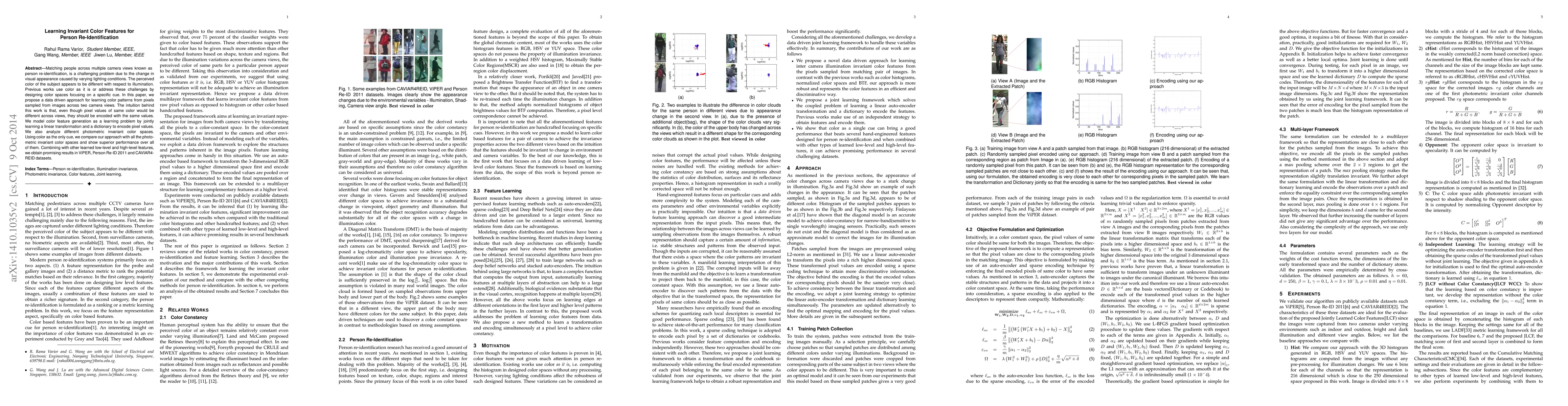 This paper proposes a data-driven method to learn invariant color features for person re-identification, addressing challenges due to varying lighting conditions. The approach models color feature generation through a linear transformation and dictionary learning, outperforming existing photometric invariant color spaces and showing promising results when combined with other features.