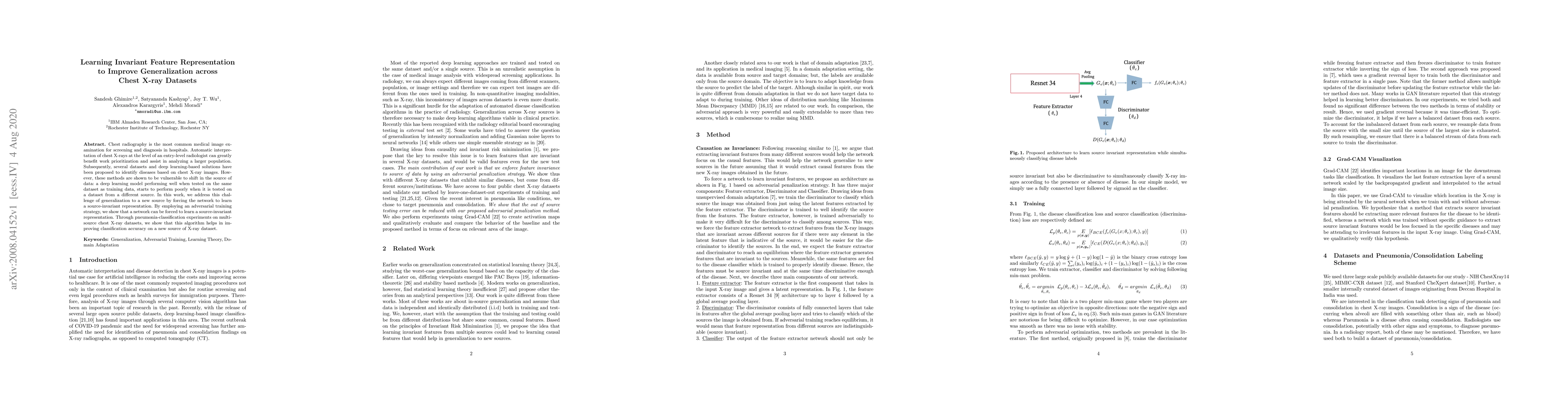 Chest radiography is the most common medical image examination for screening and diagnosis in hospitals. Automatic interpretation of chest X-rays at the level of an entry-level radiologist can greatly benefit work prioritization and assist in analyzing a larger population. Subsequently, several datasets and deep learning-based solutions have been proposed to identify diseases based on chest X-ray images. However, these methods are shown to be vulnerable to shift in the source of data: a deep learning model performing well when tested on the same dataset as training data, starts to perform poorly when it is tested on a dataset from a different source. In this work, we address this challenge of generalization to a new source by forcing the network to learn a source-invariant representation. By employing an adversarial training strategy, we show that a network can be forced to learn a source-invariant representation. Through pneumonia-classification experiments on multi-source chest X-ray datasets, we show that this algorithm helps in improving classification accuracy on a new source of X-ray dataset.