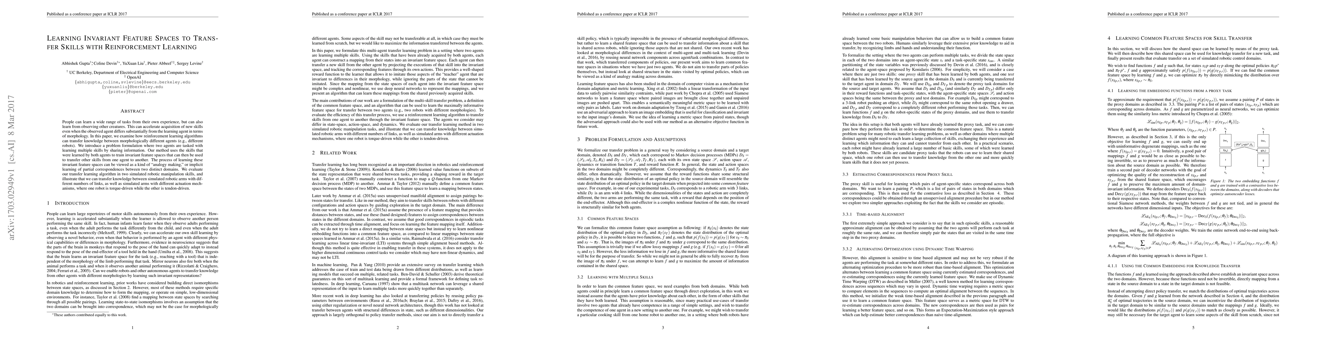 People can learn a wide range of tasks from their own experience, but can also learn from observing other creatures. This can accelerate acquisition of new skills even when the observed agent differs substantially from the learning agent in terms of morphology. In this paper, we examine how reinforcement learning algorithms can transfer knowledge between morphologically different agents (e.g., different robots). We introduce a problem formulation where two agents are tasked with learning multiple skills by sharing information. Our method uses the skills that were learned by both agents to train invariant feature spaces that can then be used to transfer other skills from one agent to another. The process of learning these invariant feature spaces can be viewed as a kind of "analogy making", or implicit learning of partial correspondences between two distinct domains. We evaluate our transfer learning algorithm in two simulated robotic manipulation skills, and illustrate that we can transfer knowledge between simulated robotic arms with different numbers of links, as well as simulated arms with different actuation mechanisms, where one robot is torque-driven while the other is tendon-driven.