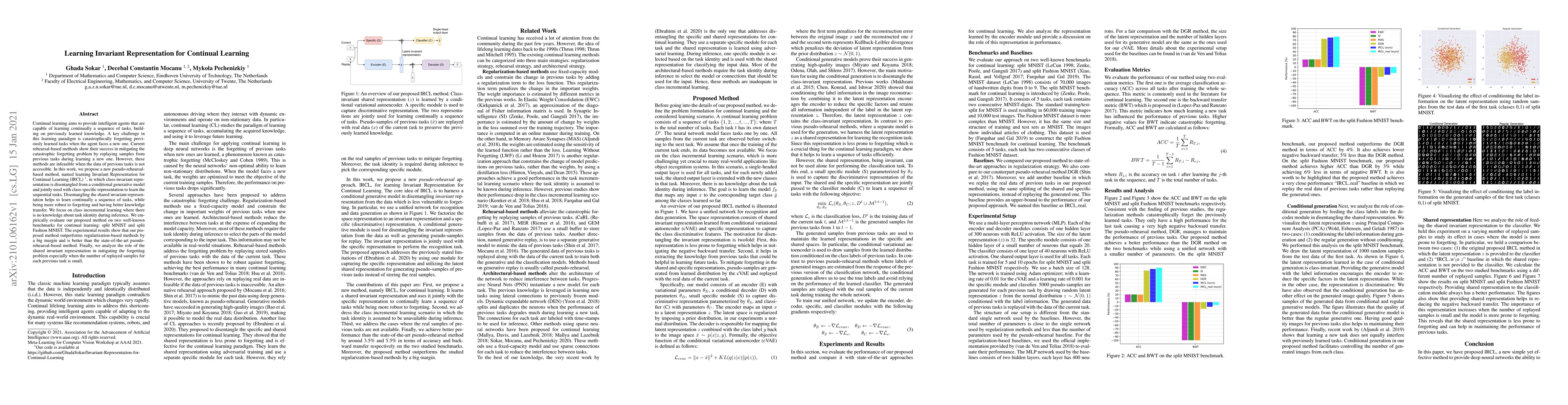 This paper proposes a pseudo-rehearsal-based method called IRCL to address the challenge of catastrophic forgetting in continual learning. It disentangles a class-invariant representation from a generative model to facilitate continual learning and improve knowledge transfer, outperforming existing methods on benchmarks.