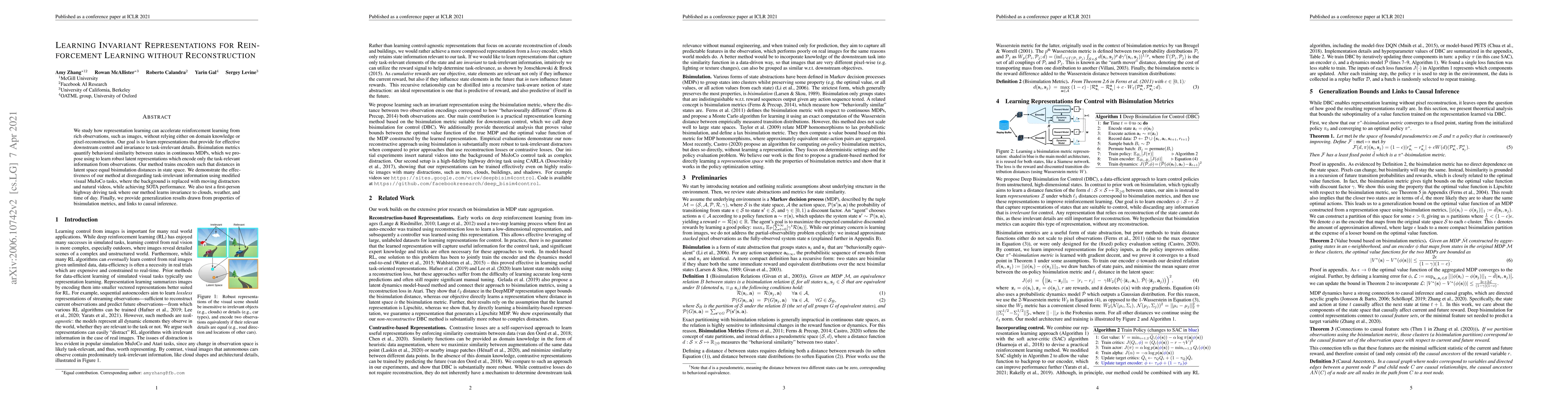 This paper proposes a method to learn invariant representations for reinforcement learning from rich observations like images, without reconstruction or domain knowledge. It uses bisimulation metrics to train encoders that encode only task-relevant information, achieving state-of-the-art performance in visual MuJoCo tasks and generalization in a first-person driving task.