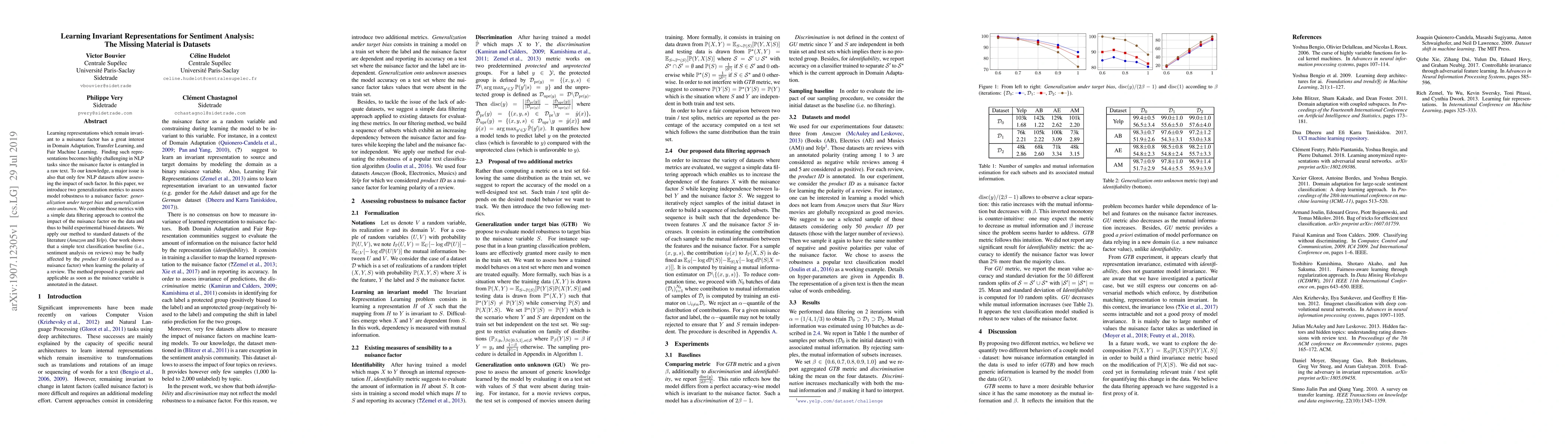 Learning representations which remain invariant to a nuisance factor has a great interest in Domain Adaptation, Transfer Learning, and Fair Machine Learning. Finding such representations becomes highly challenging in NLP tasks since the nuisance factor is entangled in a raw text. To our knowledge, a major issue is also that only few NLP datasets allow assessing the impact of such factor. In this paper, we introduce two generalization metrics to assess model robustness to a nuisance factor: \textit{generalization under target bias} and \textit{generalization onto unknown}. We combine those metrics with a simple data filtering approach to control the impact of the nuisance factor on the data and thus to build experimental biased datasets. We apply our method to standard datasets of the literature (\textit{Amazon} and \textit{Yelp}). Our work shows that a simple text classification baseline (i.e., sentiment analysis on reviews) may be badly affected by the \textit{product ID} (considered as a nuisance factor) when learning the polarity of a review. The method proposed is generic and applicable as soon as the nuisance variable is annotated in the dataset.