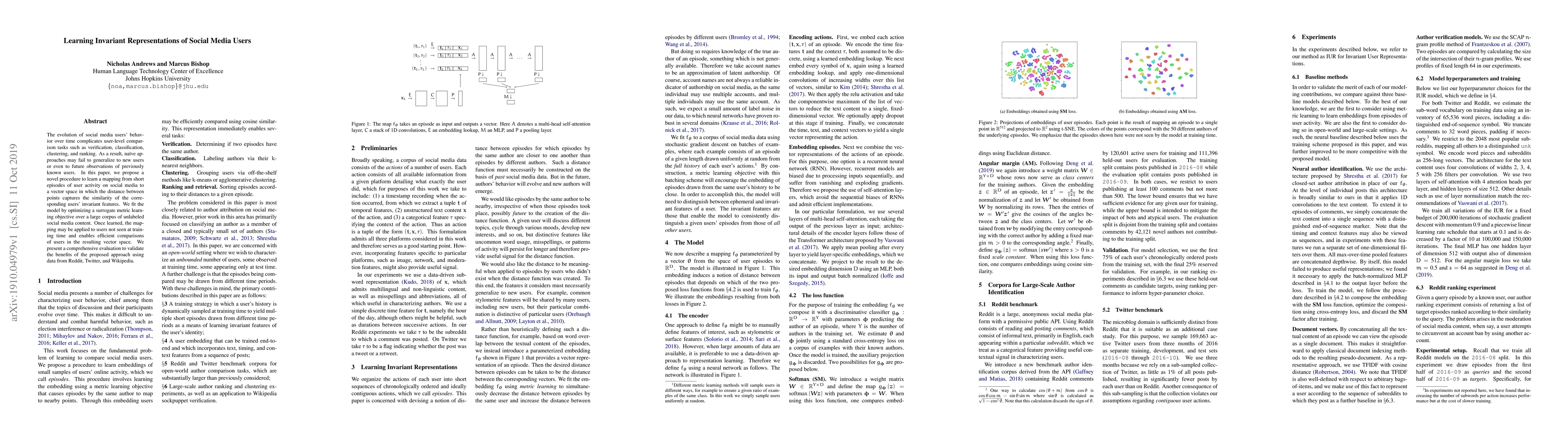 The paper proposes a novel procedure to learn a mapping from short episodes of user activity on social media to a vector space, where the distance between points captures the similarity of users' invariant features. This is achieved by optimizing a surrogate metric learning objective over a large corpus of unlabeled social media content.