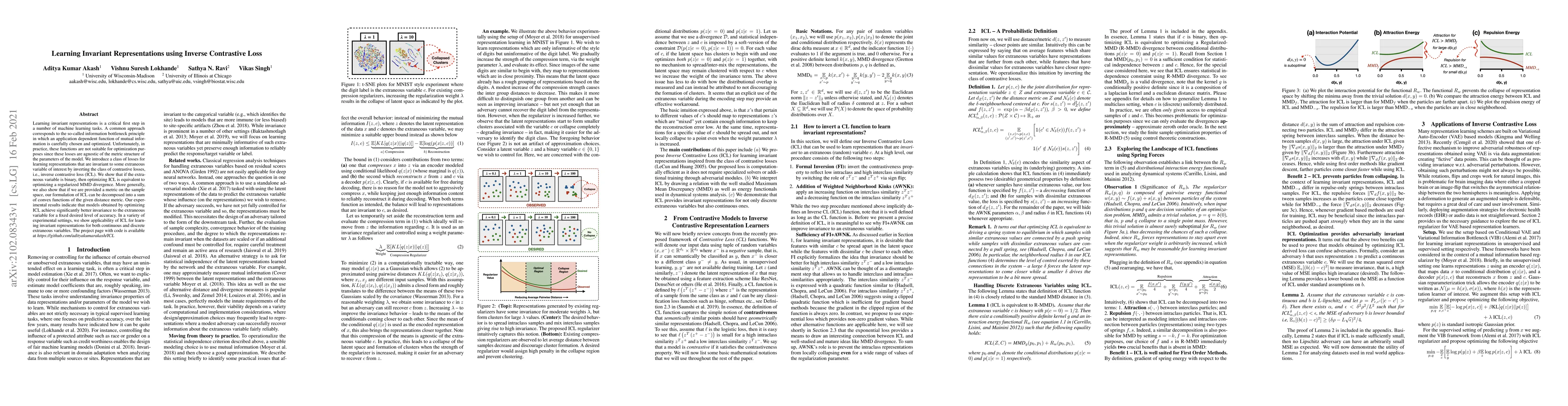 This paper introduces inverse contrastive loss (ICL) to learn invariant representations by optimizing a regularized Maximum Mean Discrepancy (MMD) divergence when the extraneous variable is binary. The authors show that ICL can be decomposed into convex functions of a given distance metric and demonstrate its effectiveness in achieving better invariance across various experimental settings.