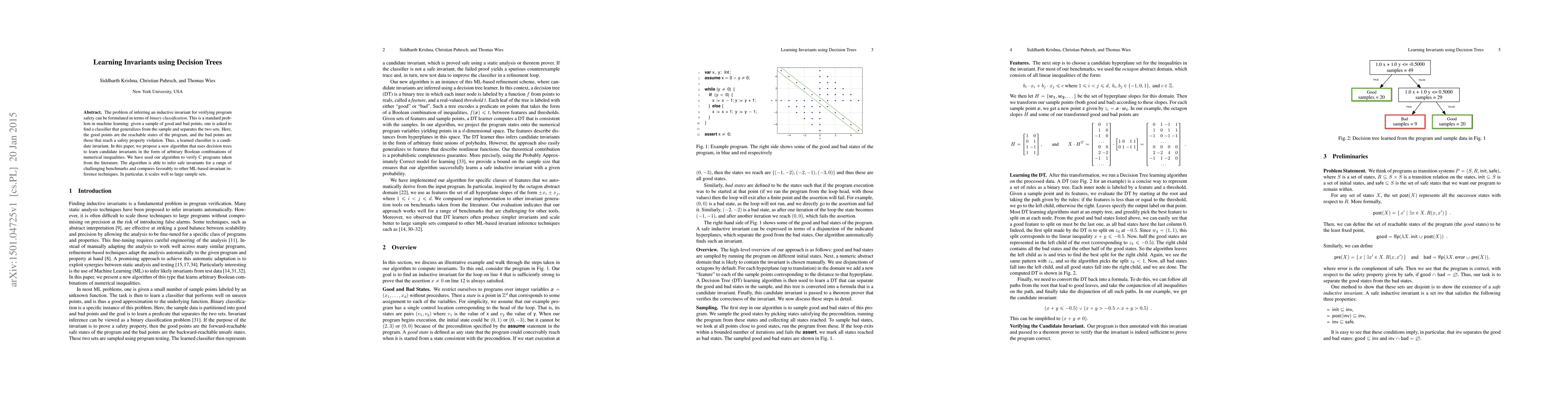 The problem of inferring an inductive invariant for verifying program safety can be formulated in terms of binary classification. This is a standard problem in machine learning: given a sample of good and bad points, one is asked to find a classifier that generalizes from the sample and separates the two sets. Here, the good points are the reachable states of the program, and the bad points are those that reach a safety property violation. Thus, a learned classifier is a candidate invariant. In this paper, we propose a new algorithm that uses decision trees to learn candidate invariants in the form of arbitrary Boolean combinations of numerical inequalities. We have used our algorithm to verify C programs taken from the literature. The algorithm is able to infer safe invariants for a range of challenging benchmarks and compares favorably to other ML-based invariant inference techniques. In particular, it scales well to large sample sets.