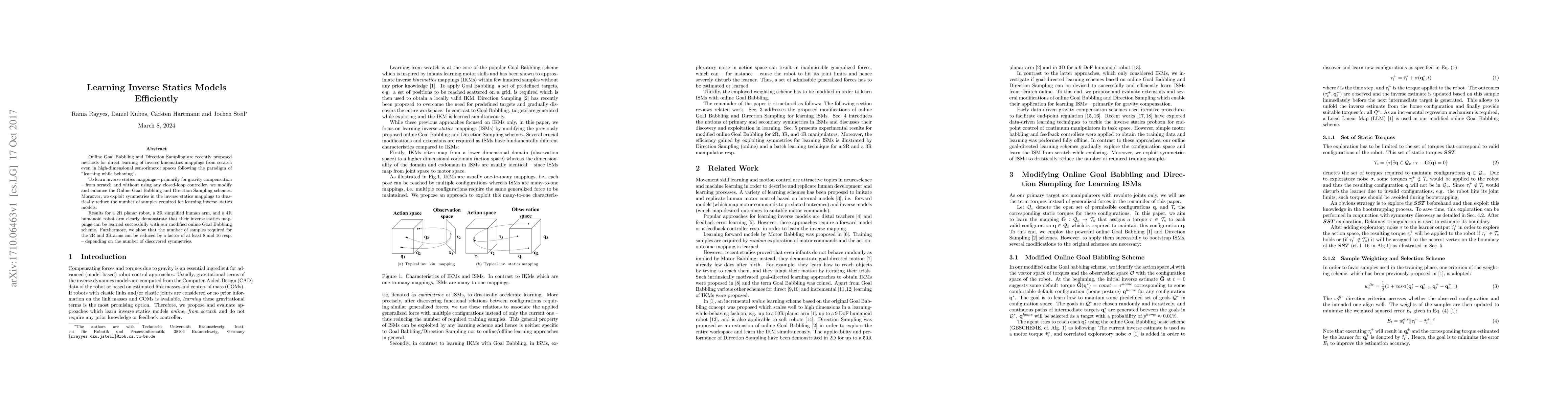 Online Goal Babbling and Direction Sampling are recently proposed methods for direct learning of inverse kinematics mappings from scratch even in high-dimensional sensorimotor spaces following the paradigm of "learning while behaving". To learn inverse statics mappings - primarily for gravity compensation - from scratch and without using any closed-loop controller, we modify and enhance the Online Goal Babbling and Direction Sampling schemes. Moreover, we exploit symmetries in the inverse statics mappings to drastically reduce the number of samples required for learning inverse statics models. Results for a 2R planar robot, a 3R simplified human arm, and a 4R humanoid robot arm clearly demonstrate that their inverse statics mappings can be learned successfully with our modified online Goal Babbling scheme. Furthermore, we show that the number of samples required for the 2R and 3R arms can be reduced by a factor of at least 8 and 16 resp. -depending on the number of discovered symmetries.