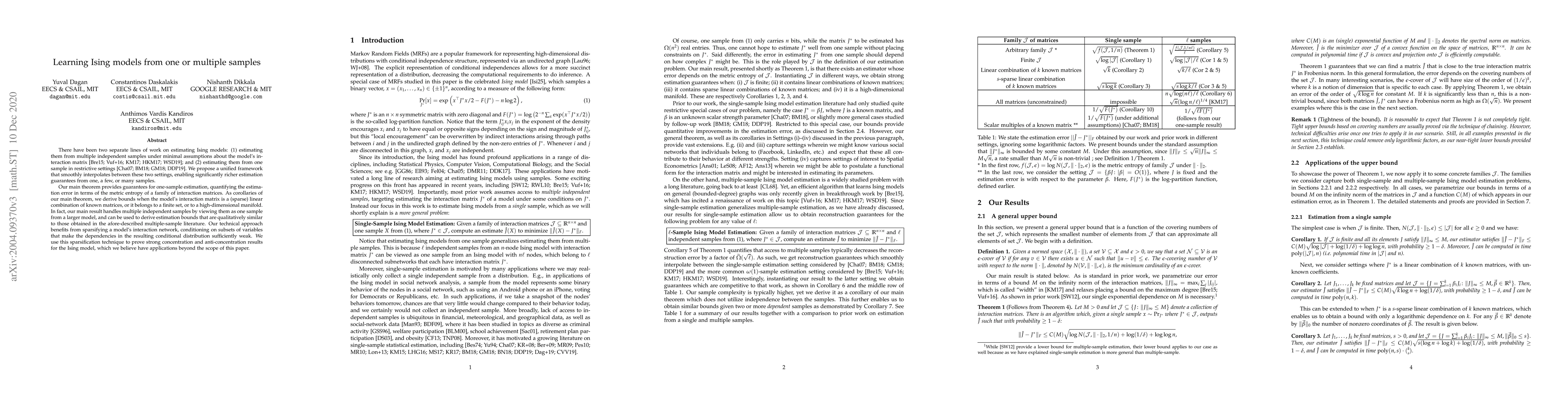 There have been two separate lines of work on estimating Ising models: (1) estimating them from multiple independent samples under minimal assumptions about the model's interaction matrix; and (2) estimating them from one sample in restrictive settings. We propose a unified framework that smoothly interpolates between these two settings, enabling significantly richer estimation guarantees from one, a few, or many samples. Our main theorem provides guarantees for one-sample estimation, quantifying the estimation error in terms of the metric entropy of a family of interaction matrices. As corollaries of our main theorem, we derive bounds when the model's interaction matrix is a (sparse) linear combination of known matrices, or it belongs to a finite set, or to a high-dimensional manifold. In fact, our main result handles multiple independent samples by viewing them as one sample from a larger model, and can be used to derive estimation bounds that are qualitatively similar to those obtained in the afore-described multiple-sample literature. Our technical approach benefits from sparsifying a model's interaction network, conditioning on subsets of variables that make the dependencies in the resulting conditional distribution sufficiently weak. We use this sparsification technique to prove strong concentration and anti-concentration results for the Ising model, which we believe have applications beyond the scope of this paper.
