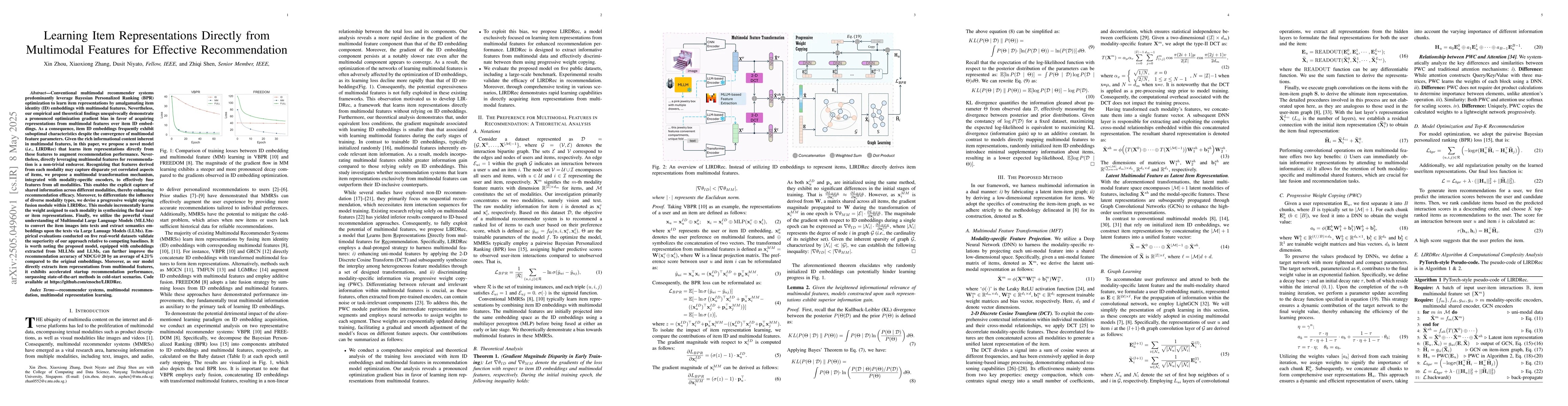 This paper proposes LIRDRec, a novel model that learns item representations directly from multimodal features to enhance recommendation performance, addressing the bias in conventional systems favoring multimodal features over item ID embeddings. The model employs a multimodal transformation mechanism and a progressive weight copying fusion module to effectively integrate diverse modality-specific features, and leverages Multimodal Large Language Models for improved semantic embeddings. Empirical results show significant improvements over baselines, with an average 4.21% increase in recommendation accuracy.
