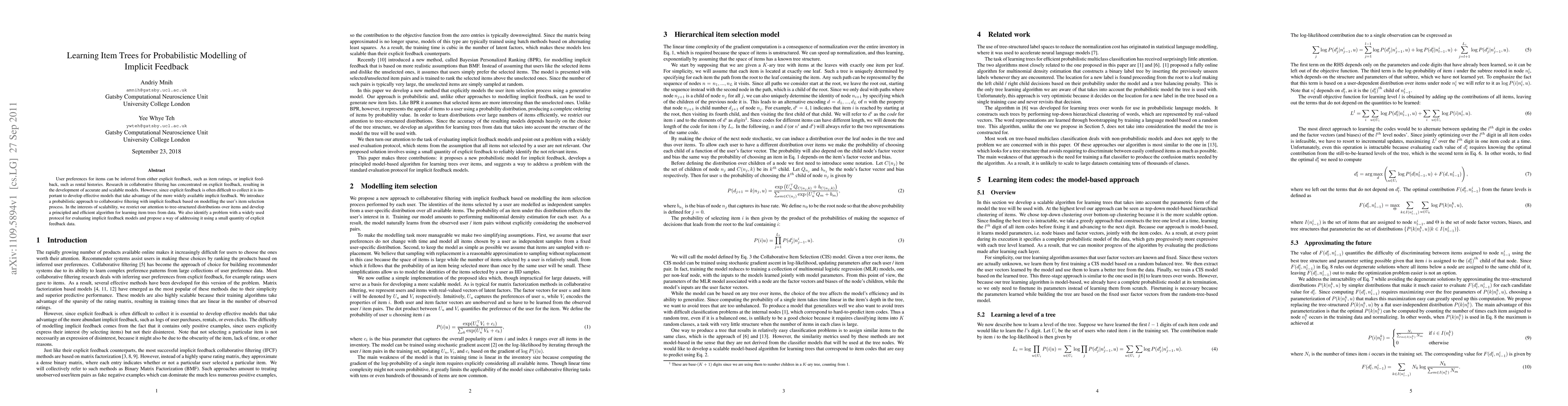 This paper proposes a probabilistic model for collaborative filtering using implicit feedback, focusing on item trees to enhance scalability. It introduces an efficient algorithm for learning item trees and addresses a common evaluation issue in implicit feedback models with minimal explicit feedback data.